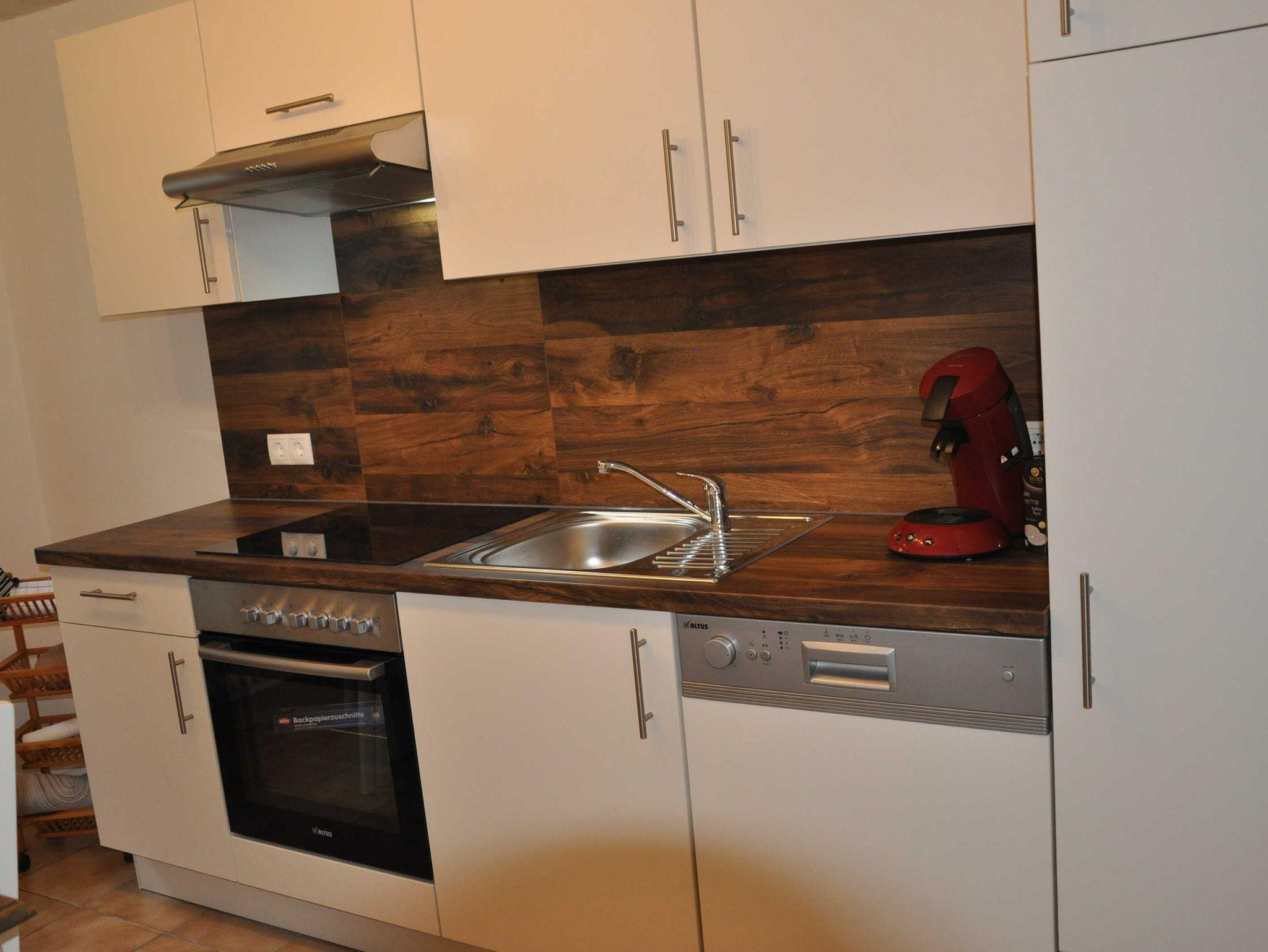 Die Küche ist mit Backofen, Cerankochfeld, Kühl- und Gefrierschrank,