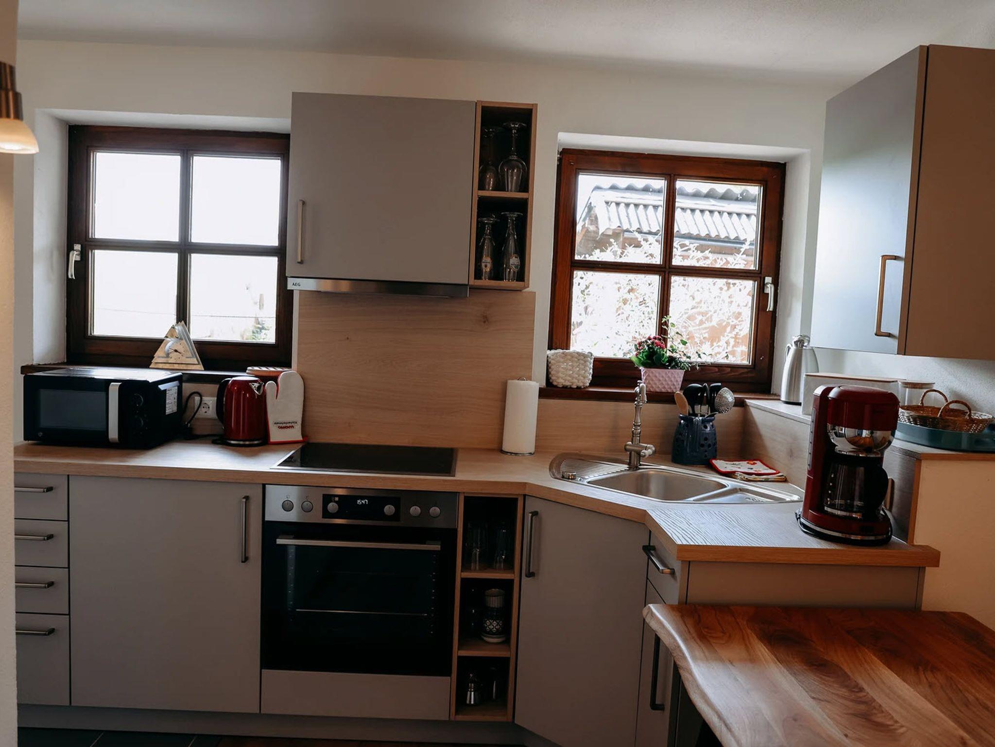 Die FeWo liegt im Erdgeschoß und hat einen eigenen Eingang.Sie hat drei Räume und das Bad, ausgestattet mit Dusche,WC, Waschbecken und Fön. Im Eingangsbereich befindet sich der Eßtisch und zwei Stühle. Die Küche ist neuwertig und modern eingerichtet. Sie verfügt über eine Mikrowelle, E-Herd, Wasserkocher, Toaster , Filterkaffeemaschine und ein kleiner Bedarf an Gewürzen. In diesem Raum befindet sich auch der Fernseher , einer bequemen Couch und Fernsehstuhl.