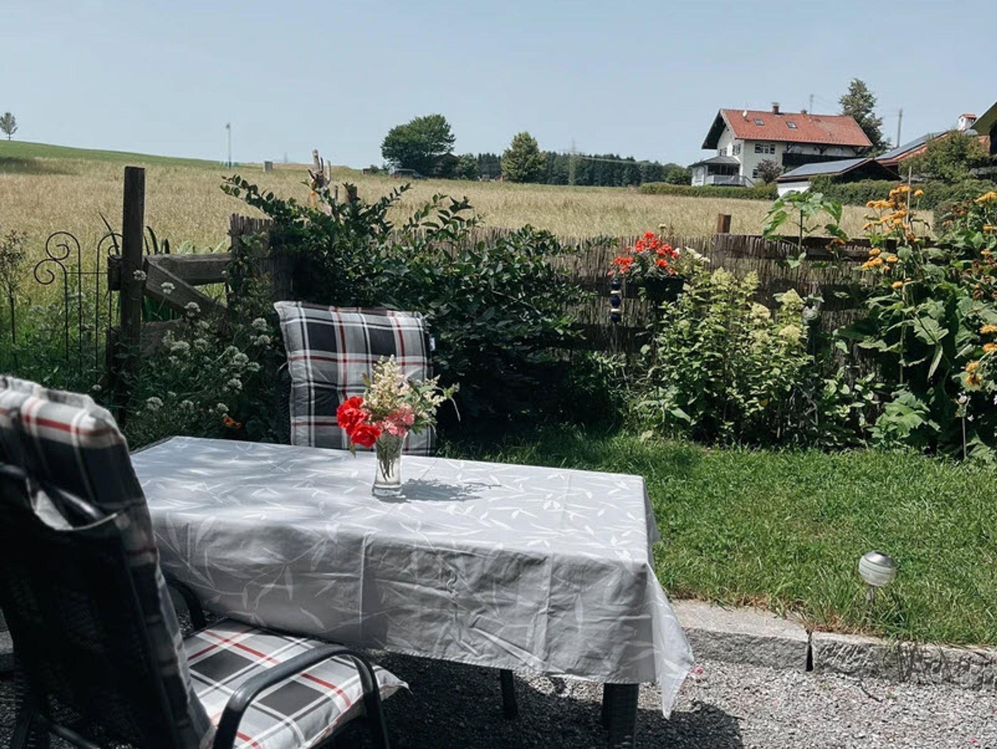 Der Außenbereich ist ein schöner Blumengarten mit Tisch, Stühle, Sonnenschirm und Sonnenliegen. Der kostenlose Parkplatz ist direkt am Eingang der FeWo.