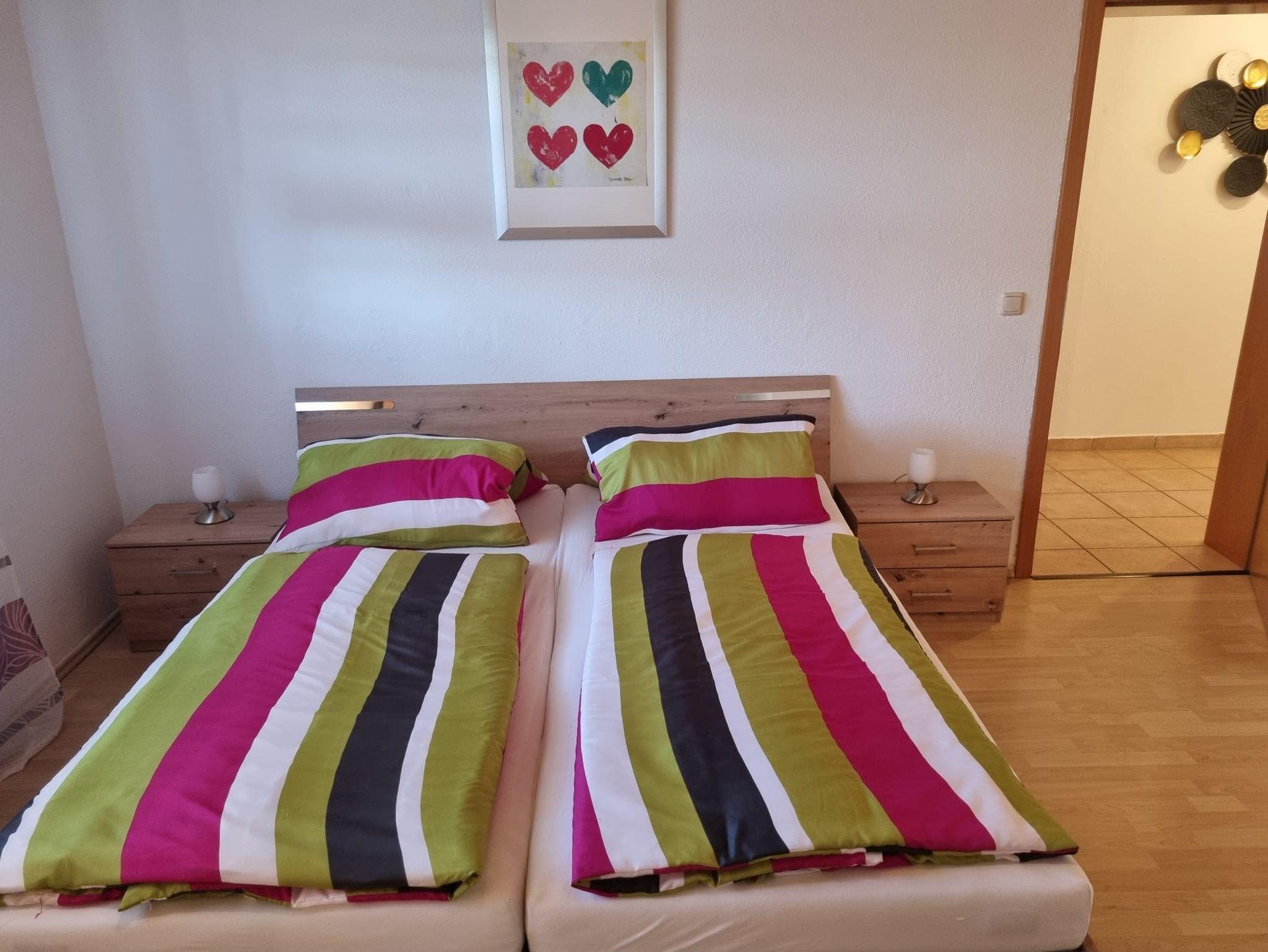 Wir bieten Ihnen Urlaub in ruhiger und doch zentraler Lage, unsere 100 m² große Wohnung verfügt über 3 Schlafzimmer (3 Betten, 2 Betten und 1 Bett) einem Bad mit Dusche/Badewanne und WC (Waschmaschine), komplett ausgestatteter Küche (mit Spülmaschine) und einem großzügigen Wohnzimmer mit Schlafcouch mit Flachbild-TV und Radio. Weitere Ausstattungsmerkmale sind ein separater Aufgang, WLan-Anschluss (Glasfaser) und ein großer Südbalkon.