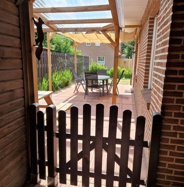 Der Garten mit einer überdachten Terrasse ist ein idealer Ort zum entspannen, verweilen und draußen speisen.