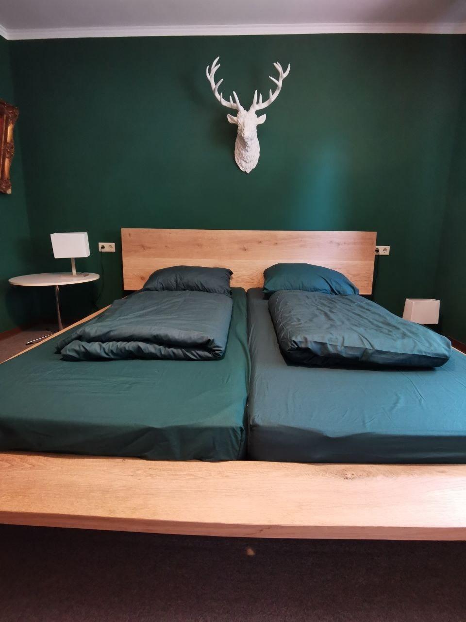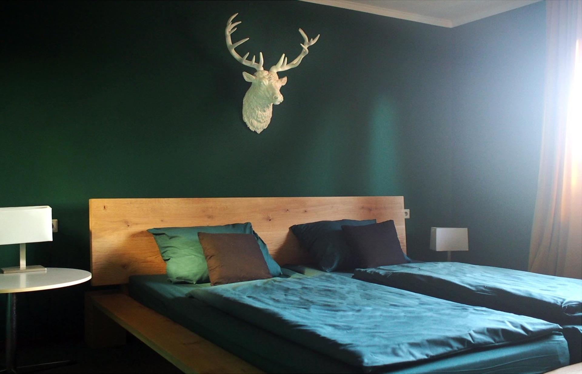 Das grüne Schlafzimmer im Untergeschoss ist mit einem großen Holzbett aus Wildeiche incl. Doppelmatratze eingerichtet. Ein majestätischer Hirschkopf wacht an der Wand über den Schlaf der Gäste, Samtvorhänge und Plissees dämpfen das Licht und tragen zur Wohlfühlatmosphäre bei.