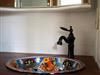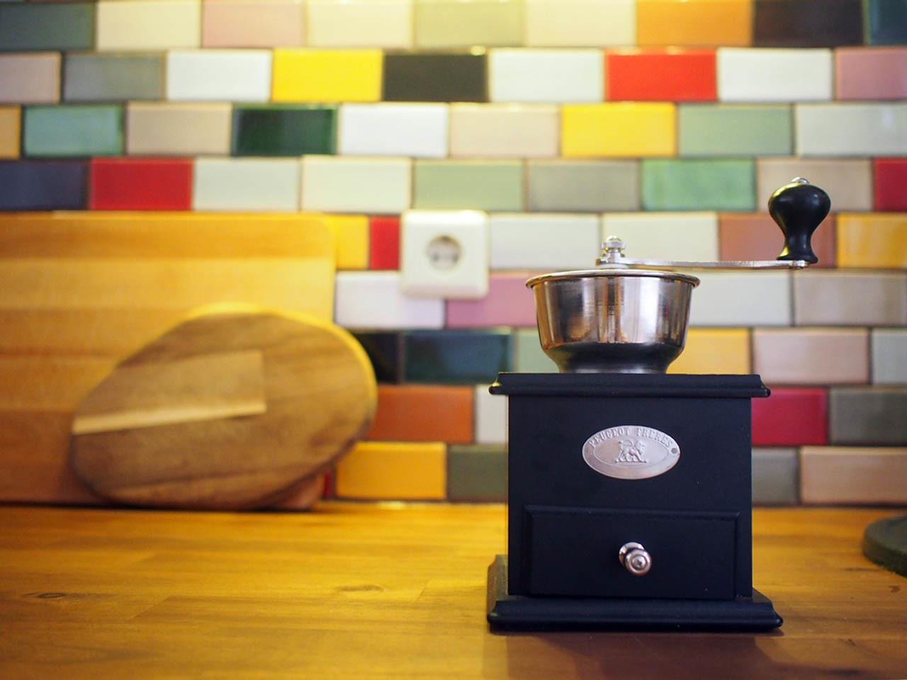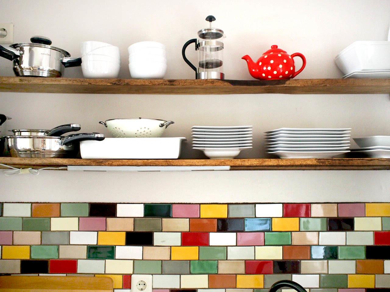 Auch die Küche wurde liebevoll umgestaltet. Holzregale aus alten Eichenbrettern beherbergen Geschirr und Töpfe. Bunte, handgemachte Küchenfliesen und eine Akazienholz-Arbeitsplatte laden zu kreativen Koch-Events ein.
