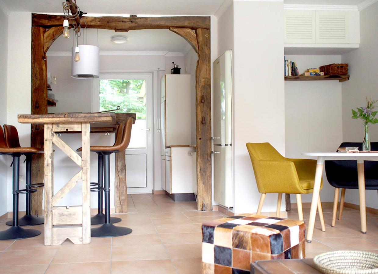 Highlight im angrenzenden großen hellen Wohnraum ist der Torbogen aus antiken Scheunenbalken, der den Wanddurchbruch zwischen Wohn-/Esszimmer und Küche ziert und einen Blick auf den Garten freigibt.