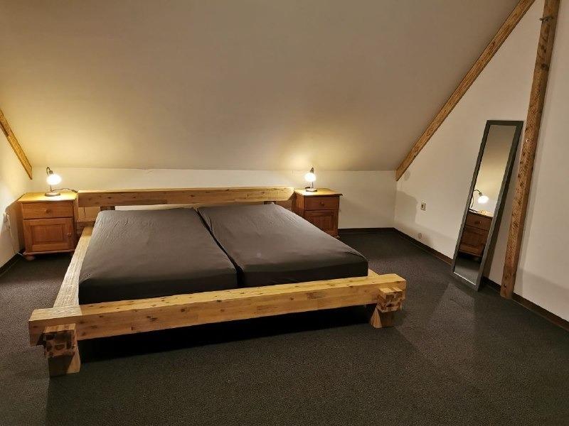 Im großen Schlafzimmer gibt es gemütliche Holzbalken und ein geräumiges Doppelbett aus massiver Akazie in Balken-Optik, ein bequemer Ohrensessel bietet eine zusätzlichen Rückzugsmöglichkeit. Die klare Raumstruktur sorgt für angenehme Atmosphäre. Samtvorhänge und Plissees an den Scheiben sorgen für erholsamen Schlaf.