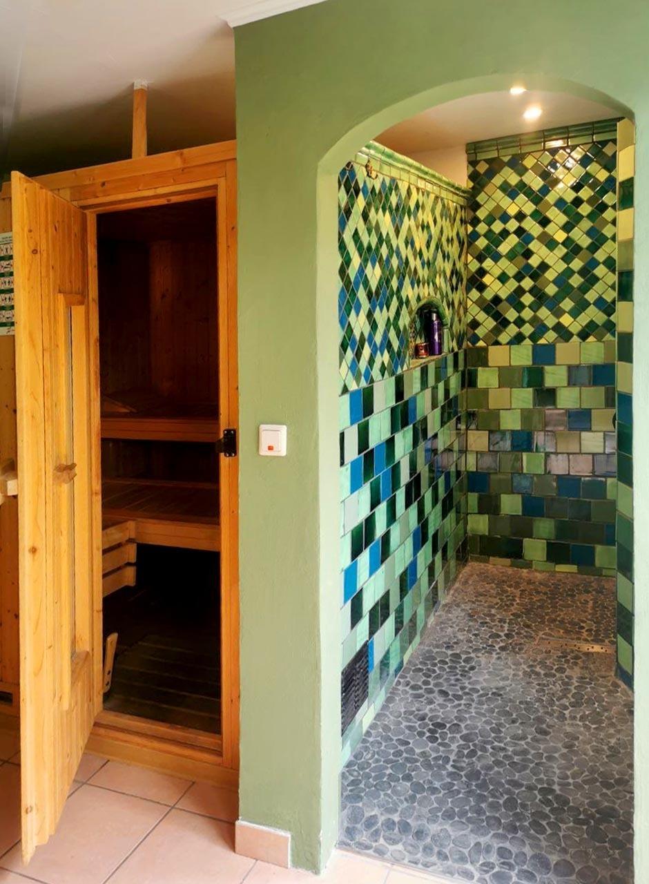 Im Sauna-Blockhaus stehen Ihnen neben der Sauna ein Ruheraum mit drei Holzliegen und eine große begehbare Dusche zur Verfügung. Mit der Klangschale und einer Bluetooth-Box (JBL Charge 3) können Sie für atmosphärische Klänge sorgen. Die Beleuchtung lässt sich farblich nach Ihren Wünschen anpassen.