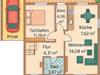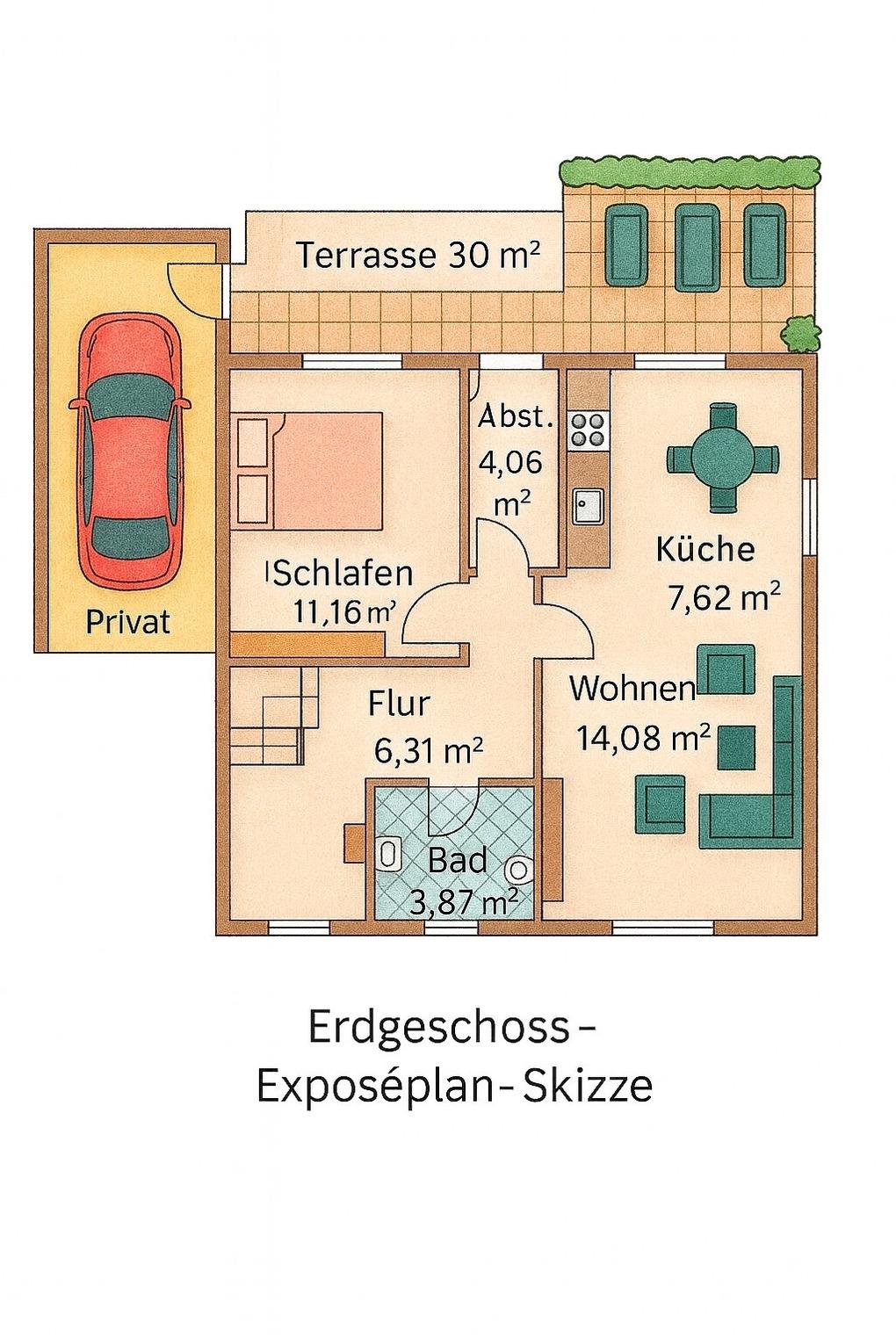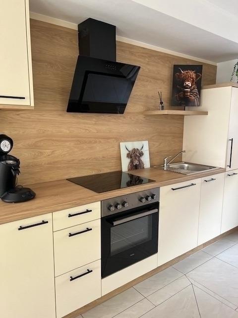 Im Erdgeschoss erwartet Sie eine einladende Wohnküche, die zum gemeinsamen Kochen und Genießen einlädt, ein komfortables Schlafzimmer mit Doppelbett sowie ein stilvolles Badezimmer mit Dusche und WC. Ein praktischer Abstellraum und ein großzügiger Flur mit Zugang zum Obergeschoss runden das Raumkonzept perfekt ab.