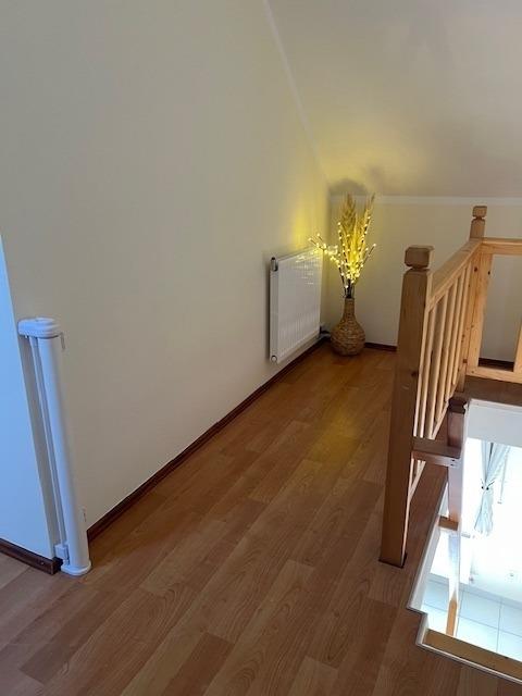 Im Obergeschoss finden Sie einen hellen Flur, ein weiteres modernes Badezimmer mit WC, ausgestattet mit Waschmaschine und Trockner, sowie ein weiteres gemütliches Schlafzimmer mit Doppelbett und einem komfortablen Schlafsessel - ideal für erholsame Nächte.