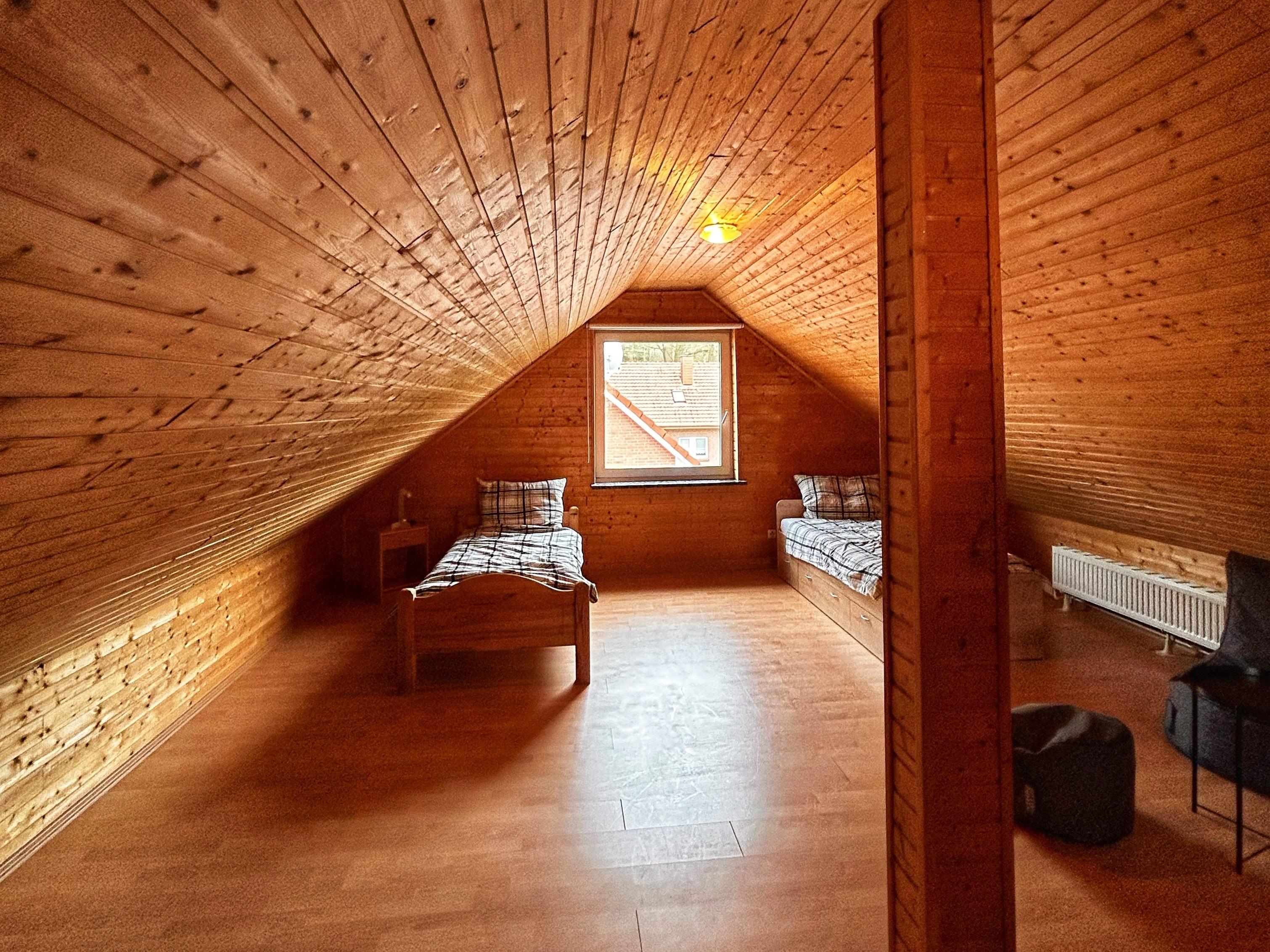 Das frei ohne Tür von der Treppe zugängliche Obergeschoss mit ca. 40 m² ist komplett als ein Raum nutzbar und verfügt über zwei Einzelbetten. Besonders Kinder und Jugendliche finden das galerieähnliche Obergeschoss mit Dachschrägen toll.