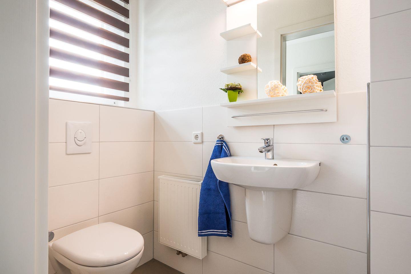 Zwei Bäder jeweils mit Waschbecken, WC und Dusche stehen zur Verfügung; im großen Bad steht eine Waschmaschine und ein Trockner.