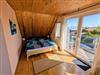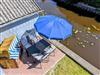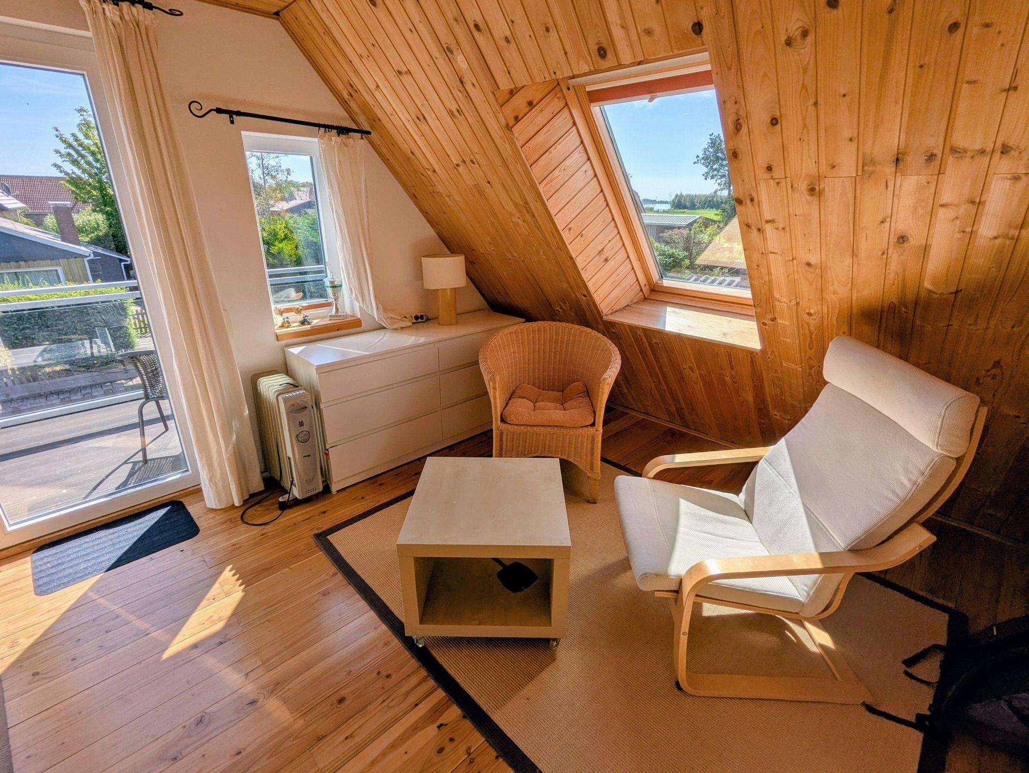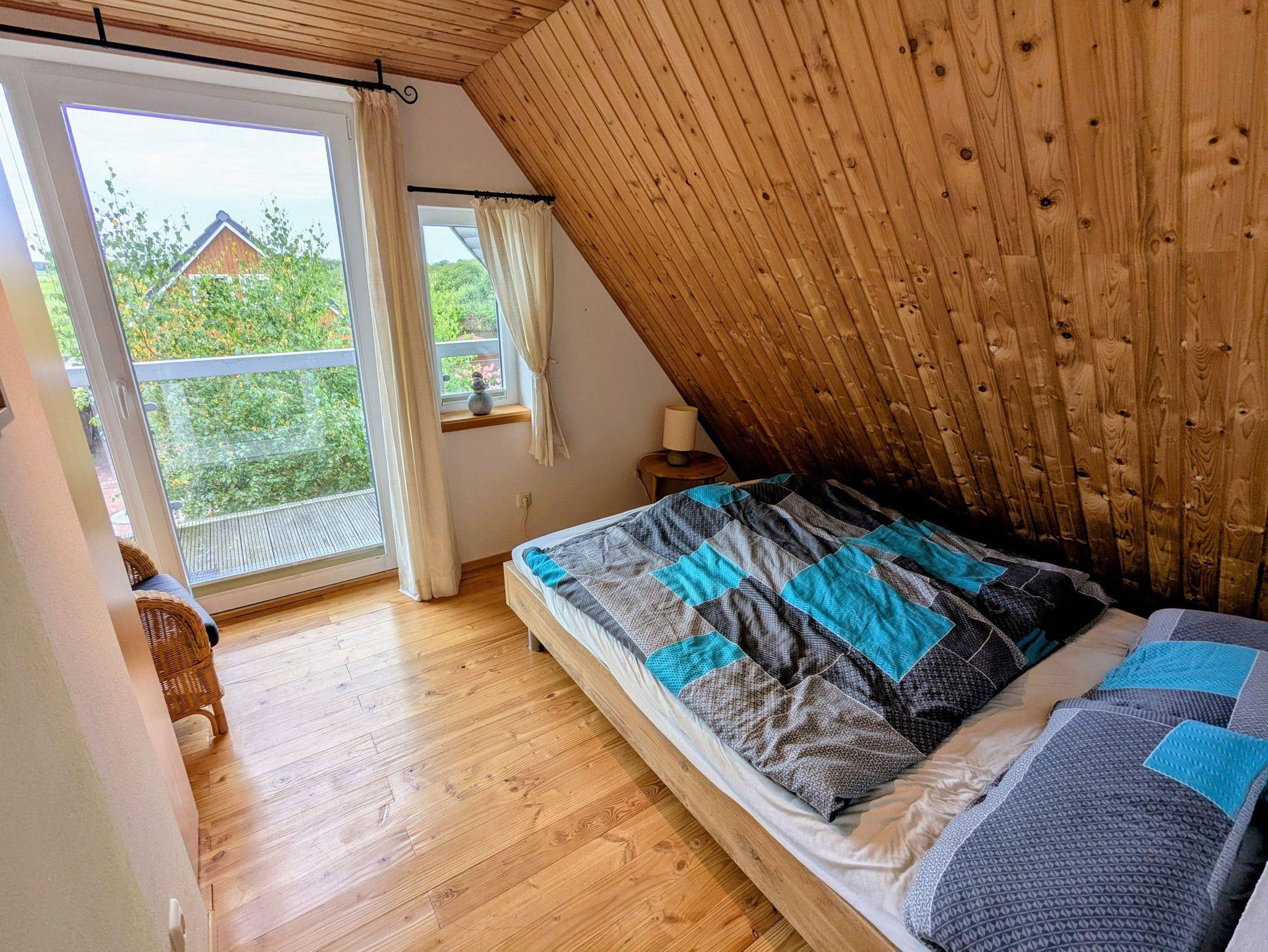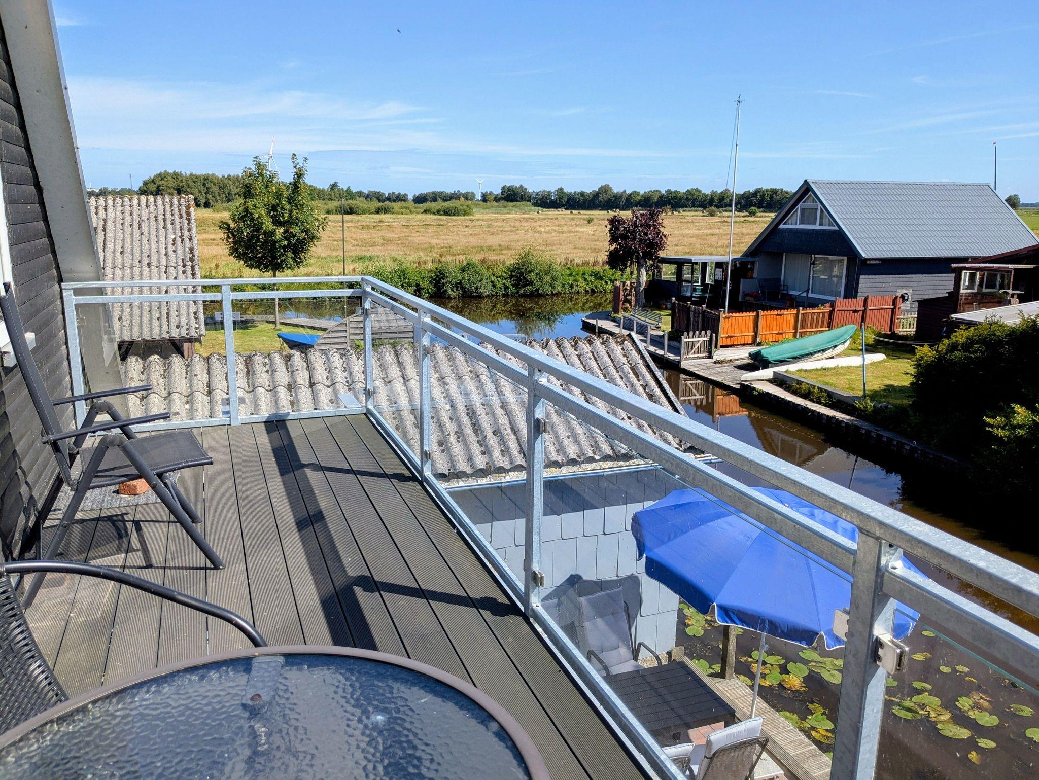 Im Obergeschoss befindet sich ein großer Schlafraum mit französischem Bett (1,60 Meter) und gemütlicher Sitzgruppe, ein weiteres Schlafzimmer mit Doppelbett (1,40 Meter) sowie ein Schlafraum mit Stockbett. Es gibt direkten Zugang zu zwei großen Balkonen mit herrlichem Blick über den Kanal und über die Meeden. Von den Balkonen aus können Sie im Sommer sowohl den Sonnenaufgang wie auch -Untergang genießen.