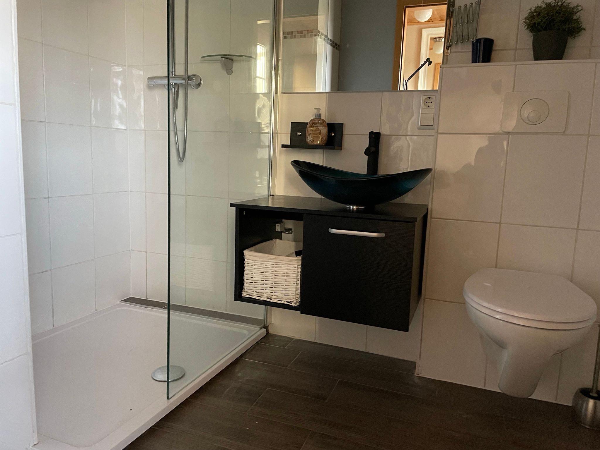 Ein Badezimmer mit Dusche und WC