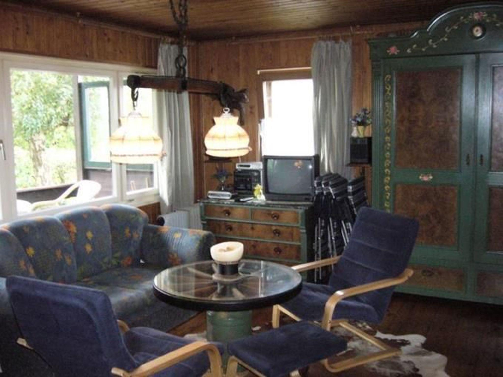 Das gemütliche Ferienhaus bietet einen komfortablen Wohnbereich mit einer einladenden 3er-Couch, einem Sessel, einem Stubentisch sowie einem Kiefer-Kleiderschrank mit Safe. Zur Unterhaltung stehen ein Sat-TV, ein Radio und ein DVD-Player zur Verfügung. Für wohlige Wärme sorgt ein kleiner elektrischer Kaminofen, ergänzt durch zusätzliche Heizungen. Die angrenzende Essgruppe mit vier Stühlen und einem Ausziehtisch lädt zu gemeinsamen Mahlzeiten ein.