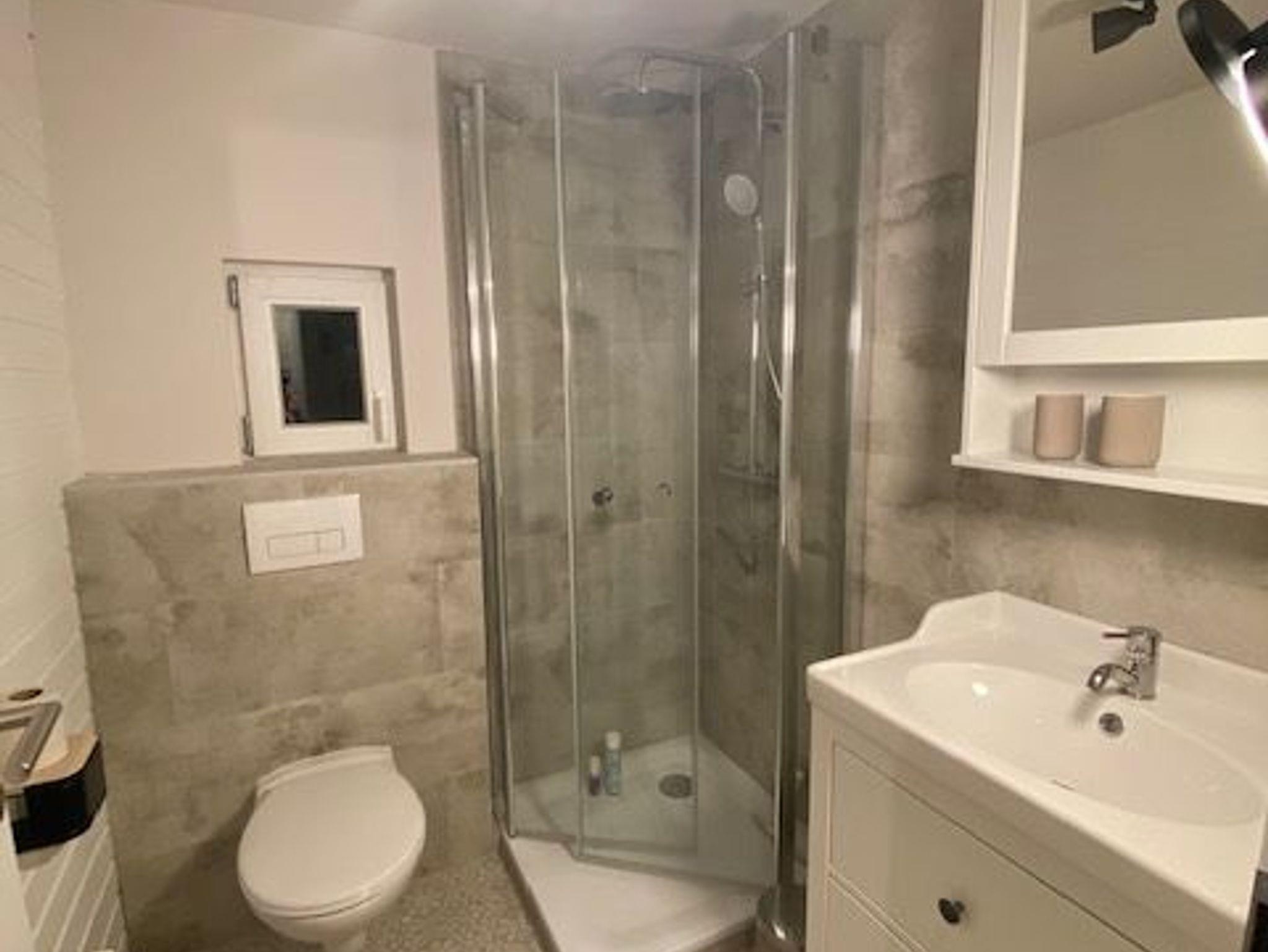 Im Erdgeschoss bietet eine moderne, ebenerdige Dusche besonderen Komfort auch für Gäste, die barrierearme Ausstattung schätzen. Der helle Wohn- und Essbereich lädt mit einem stimmungsvollen Kamin zum Verweilen ein und einen Blick ins Grüne und zum See. Vor dem Haus gibt es eine sonnige Veranda, hier lässt sich der Tag wunderbar bei einem Glas Wein oder einem Frühstück im Freien genießen.