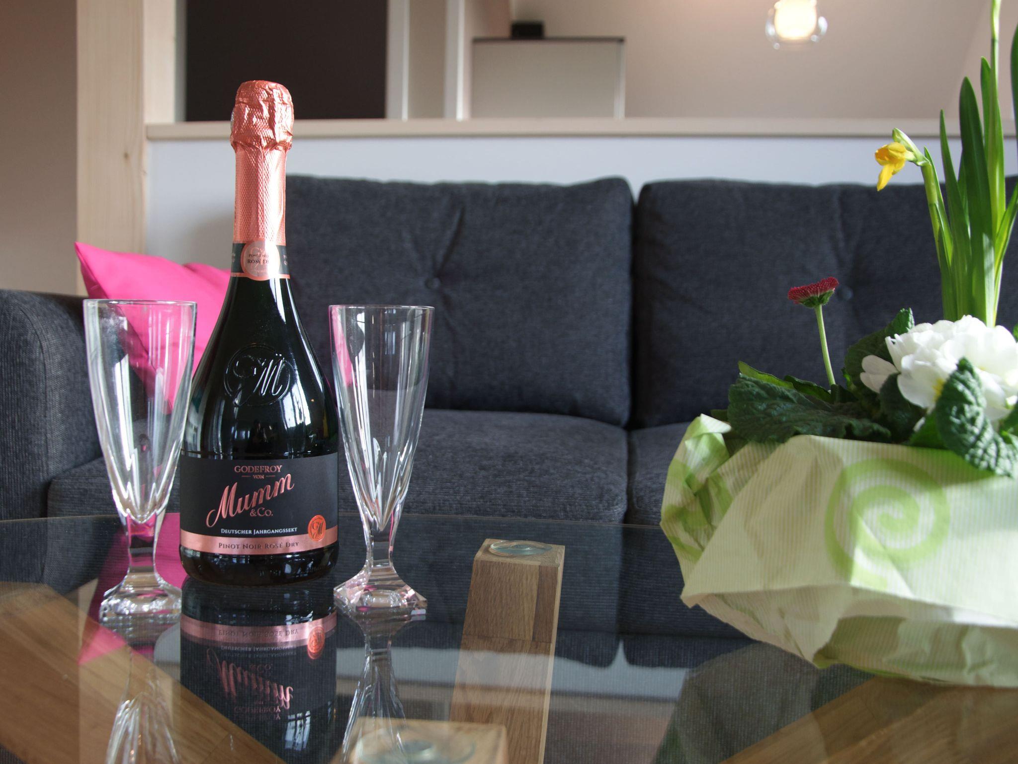 Treten Sie ein und fühlen Sie sich in einer offenen Wohngestaltung auf 60 Quadratmetern Wohnfläche wie Zuhause und doch im Urlaub. Die Küche und Essbereich sind in Kombination mit dem Wohnzimmer aber durch eine Thekenwand getrennt, wodurch ein stilvolles Trennmittel geschaffen wird. Lichtdurchflutet und hell eingerichtet. Mit den passenden Farben trifft sich eine Kombination zum angenehmen Aufenthalt.