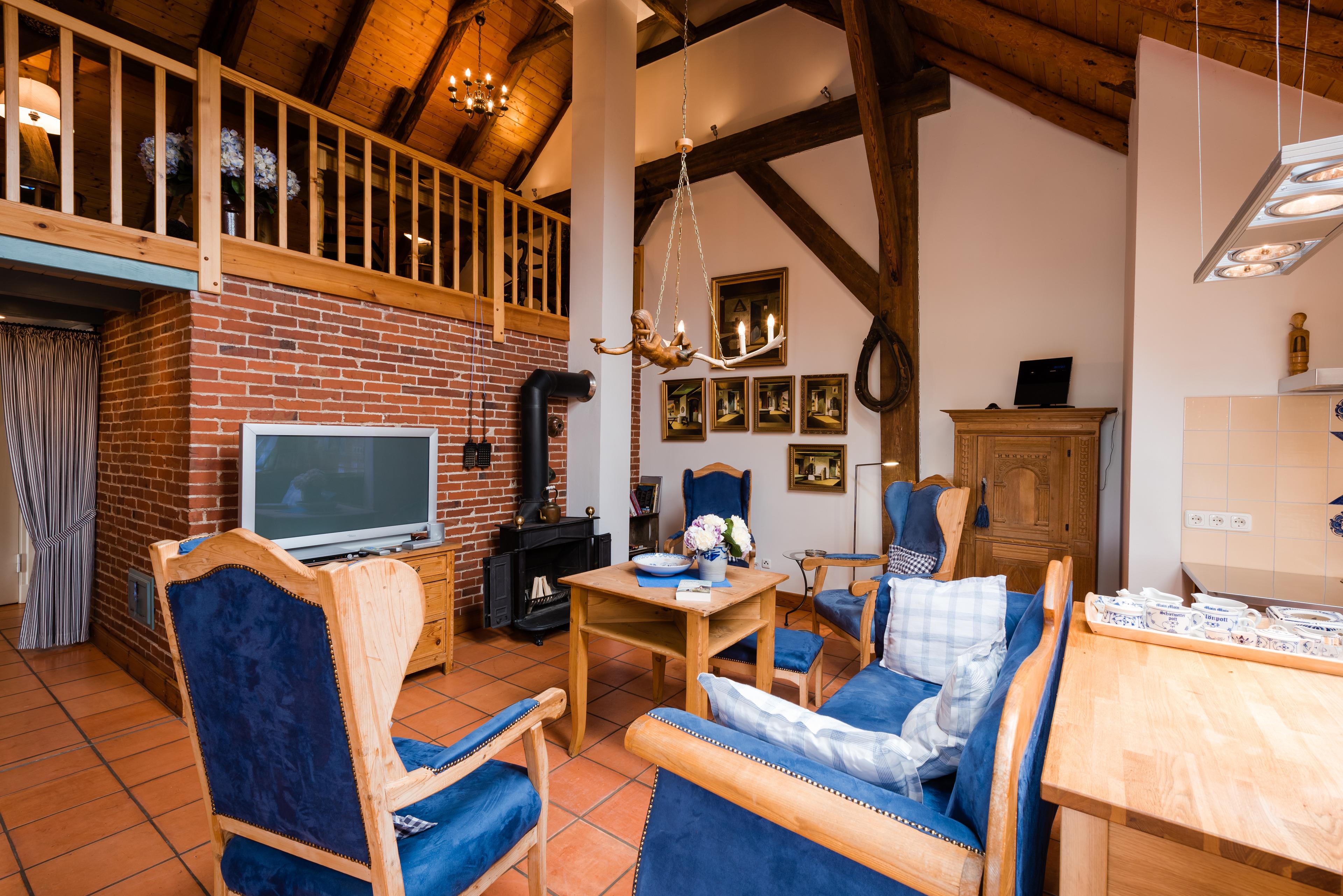 Im Stall von damals ist der Grundriss bis auf wenig Veränderungen erhalten worden. Der Schweinestall wurde zum Schlafzimmer, der Scheunenbereich von einst ein komfortables Wohnzimmer. Aus dem verglasten Scheunentor treten Sie hinaus auf die Terrasse. Ein Sitzplatz am offenen Naturkanal lockt ebenso wie der am Wasserbecken, in dem sich Goldfische tummeln. Die Stallwohnung ist übrigens behindertenfreundlich, da vollkommen schwellenfrei im Erdgeschoss.