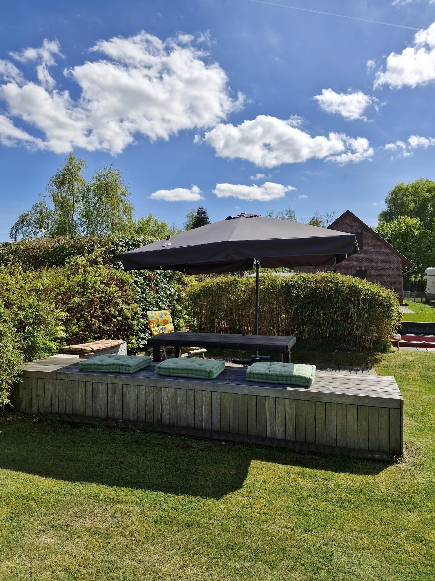 Eine große Terrasse sowie eine weitere gemütliche Sitzecke im Garten nahe des Bootssteges laden zum verweilen am Wasser ein.