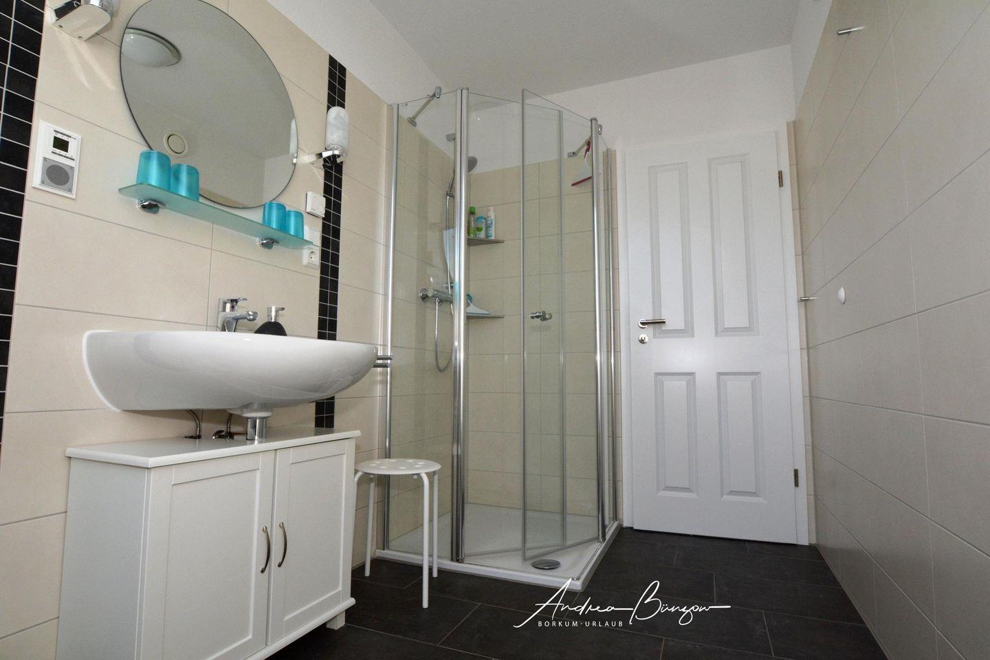 Das Bad mit Dusche und WC teilen sich jeweils 2 Zimmer