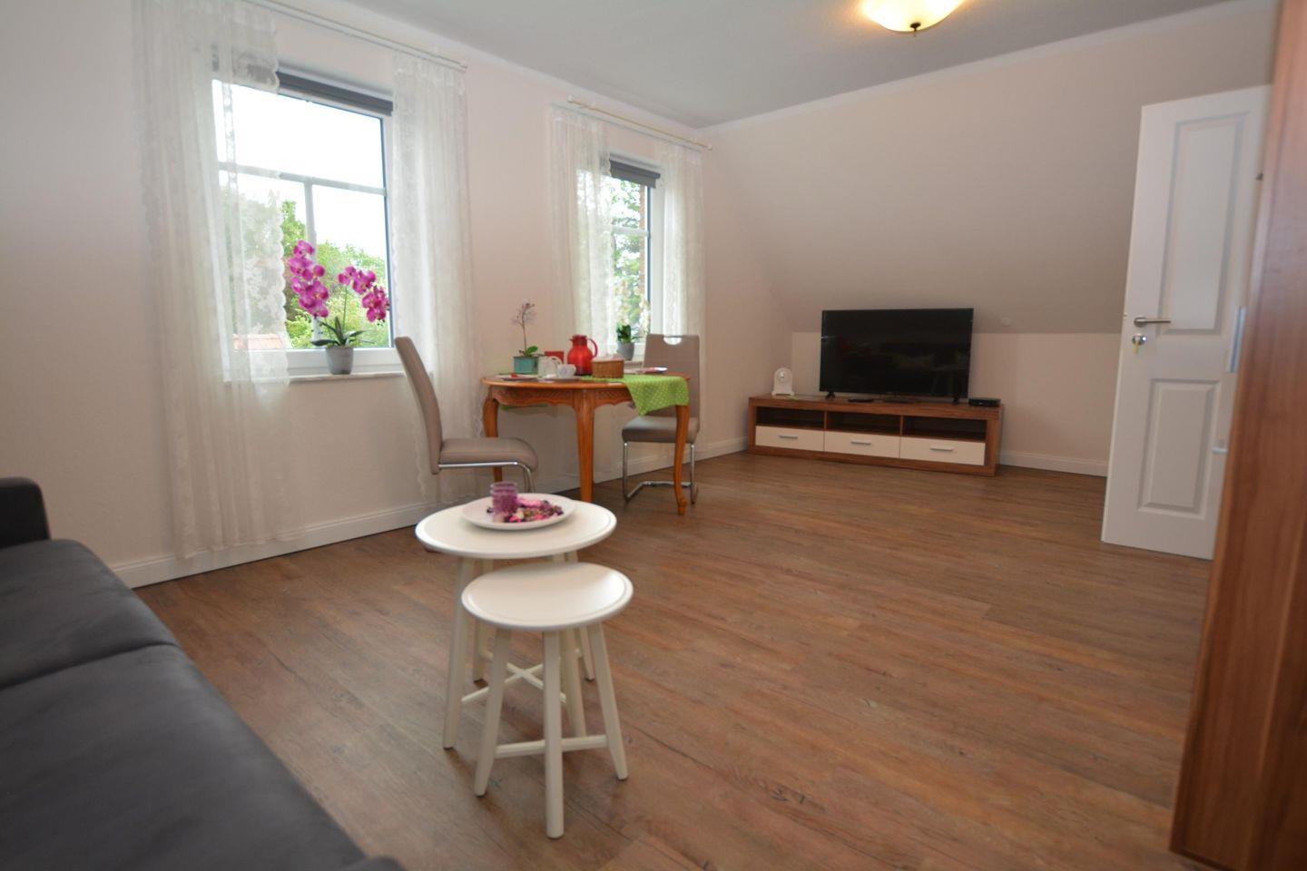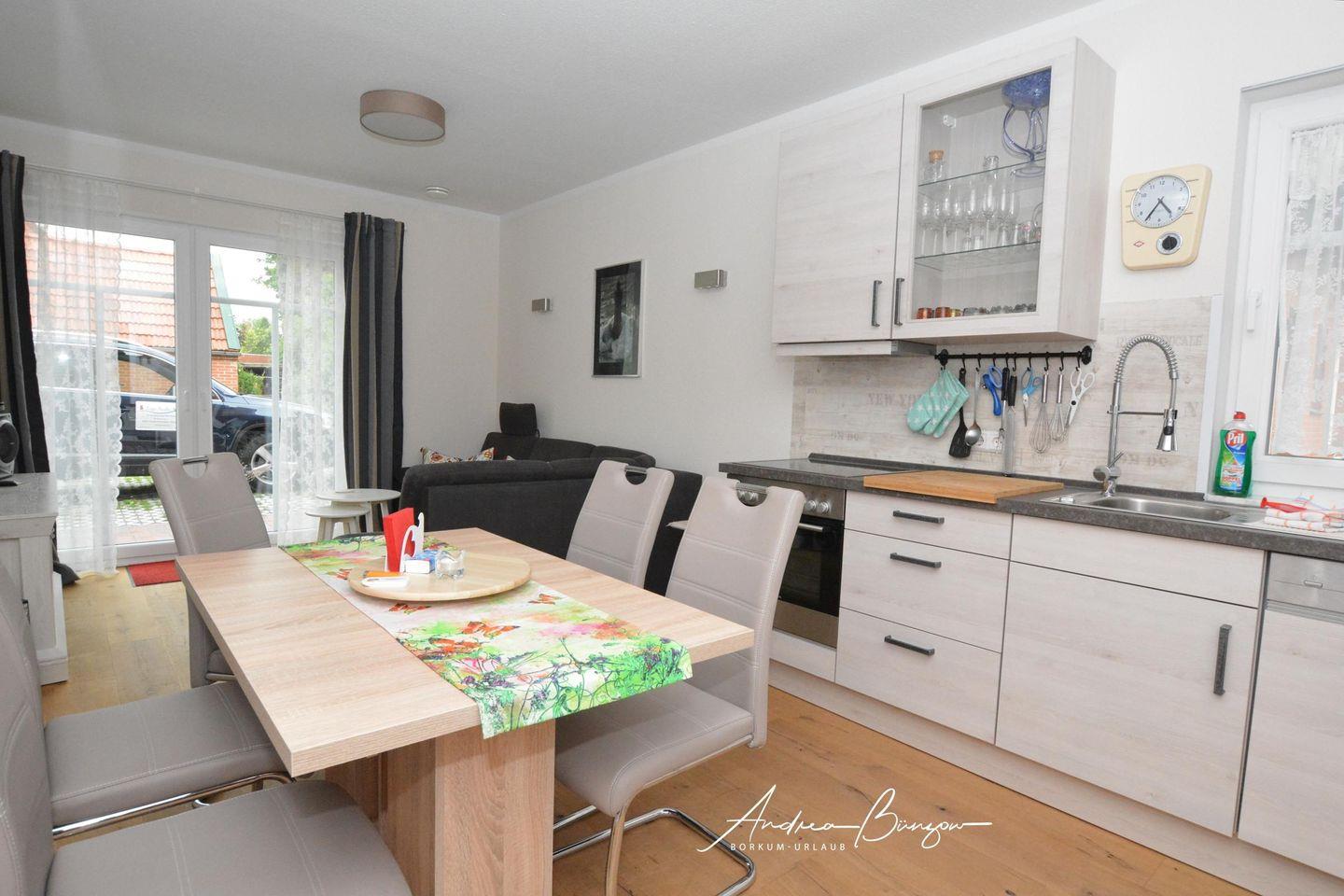 Im Erdgeschoss befindet sich die Wohnküche als Gemeinschaftsraum mit TV, Blue-Ray-Player und Stereoanlage.