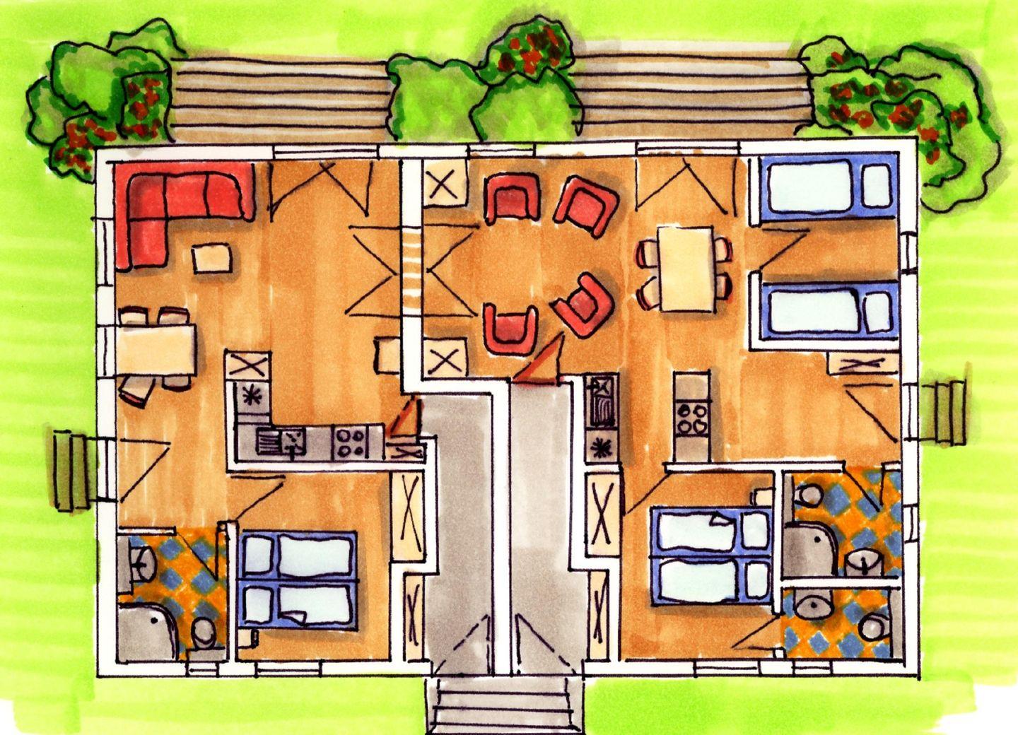 Auf Anfrage kann die Wohnung Koje mit der Wohnung Ausguck kombiniert werden. Die „Brücke“ verfügt dann über 90 m². Sie besteht aus den einzelnen Wohnungen Ausguck und Koje und ist über eine Doppeltüranlage zu öffnen, sodass man von einem Wohnzimmer bequem in das andere Wohnzimmer gelangt. Auf Wunsch kann bei Bedarf die Tür auch geschlossen werden, sodass jede Einheit zeitweilig auch separat genutzt werden kann.