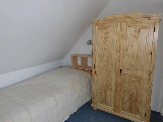 Im Erdgeschoss befinden sich die großzügig eingerichtete Küche sowie der helle Wohnraum mit Sitzgarnitur, Essplatz und anschließender Terrasse. Das mit sichtbaren Holzbalken ausgestattete Schlafzimmer liegt im Obergeschoss und bietet neben einem Doppelbett ein zusätzliches Einzelbett. Auch eine kleine Sitzecke ist vorhanden. Der Balkon ist vom Schlafzimmer aus erreichbar. Das Badezimmer mit Dusche und WC befindet sich ebenfalls im Obergeschoss.