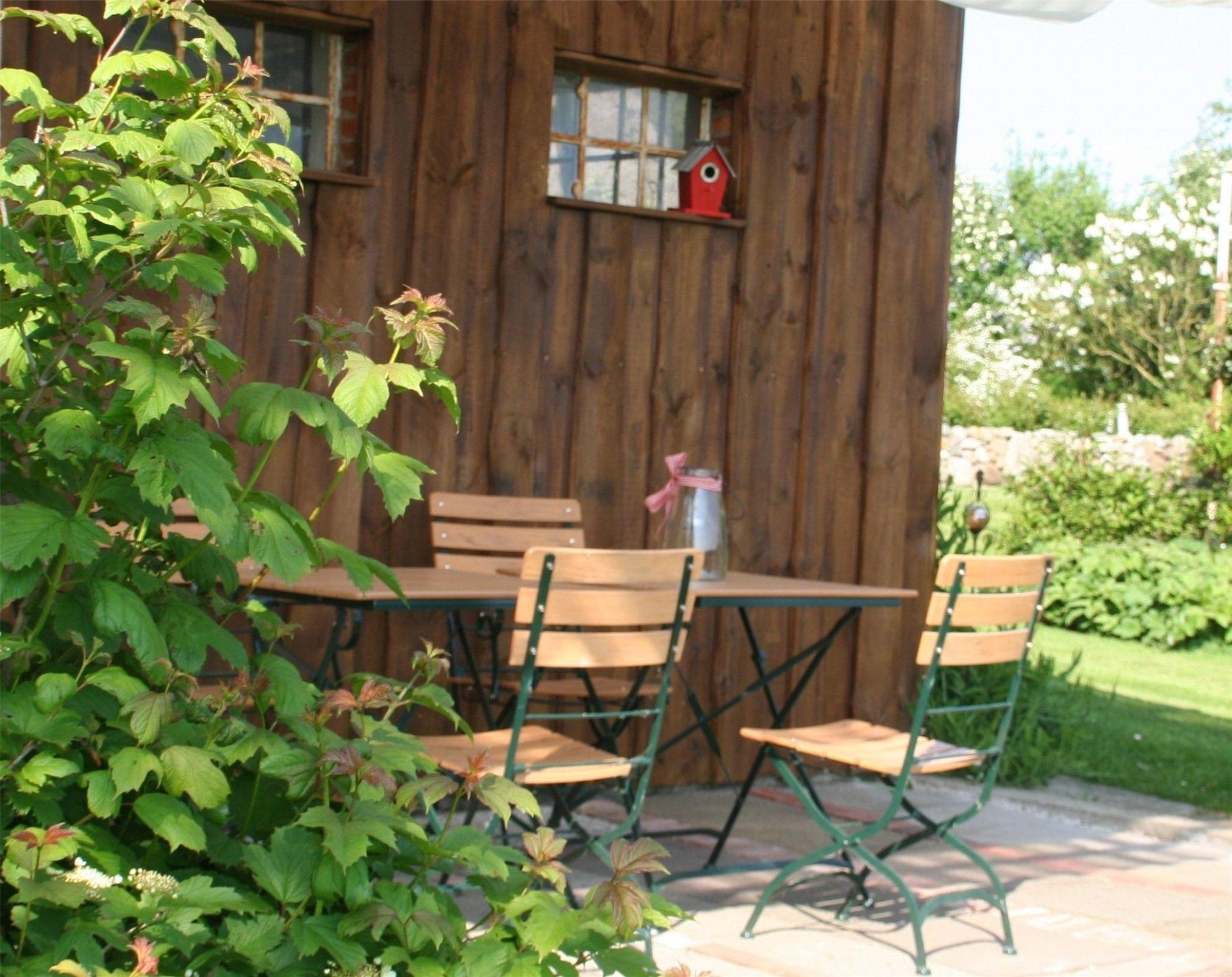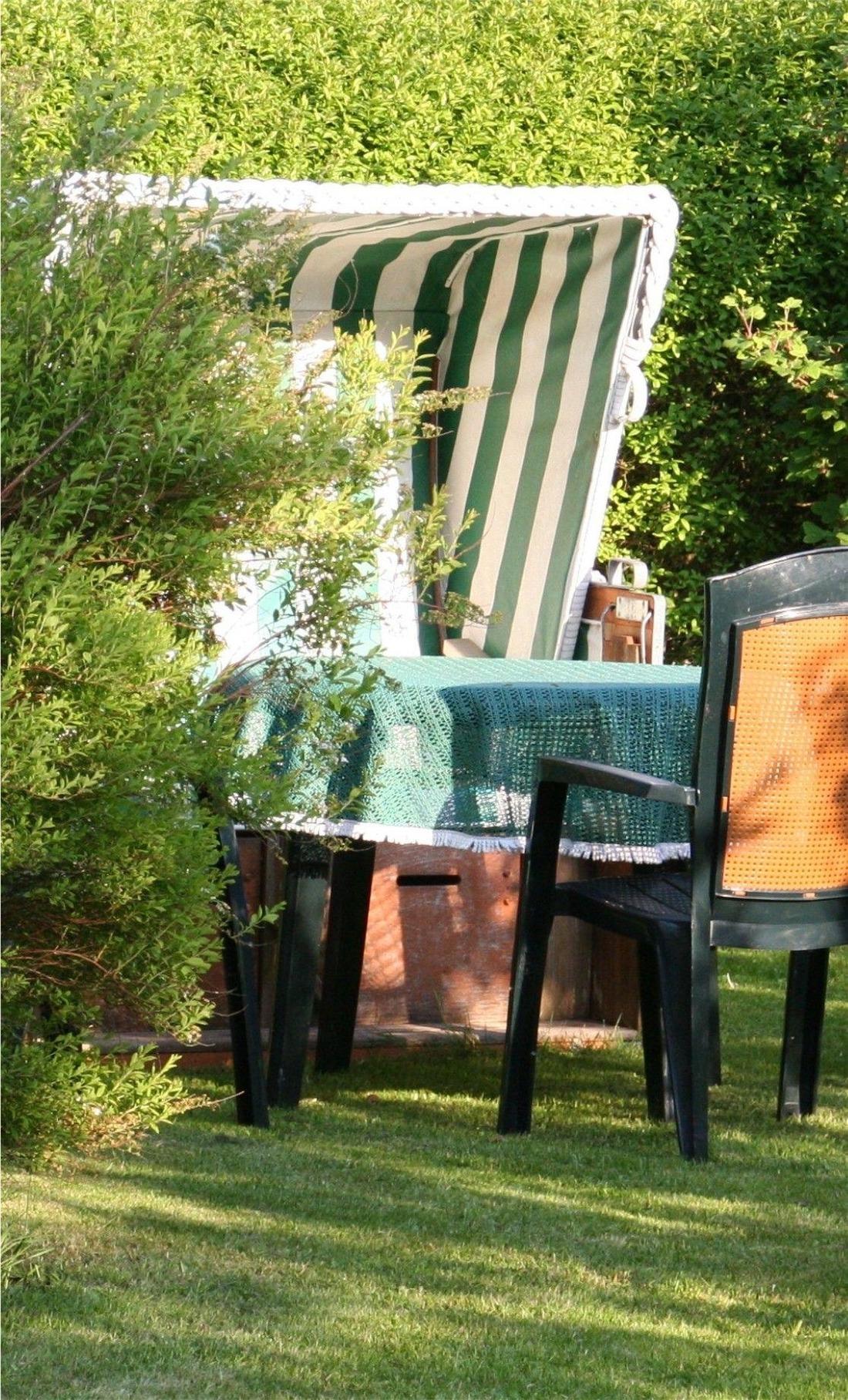 Im großen Garten finden Sie mehrere geschützte Sitzplätze mit Gartenmöbeln und Strandkörben.
