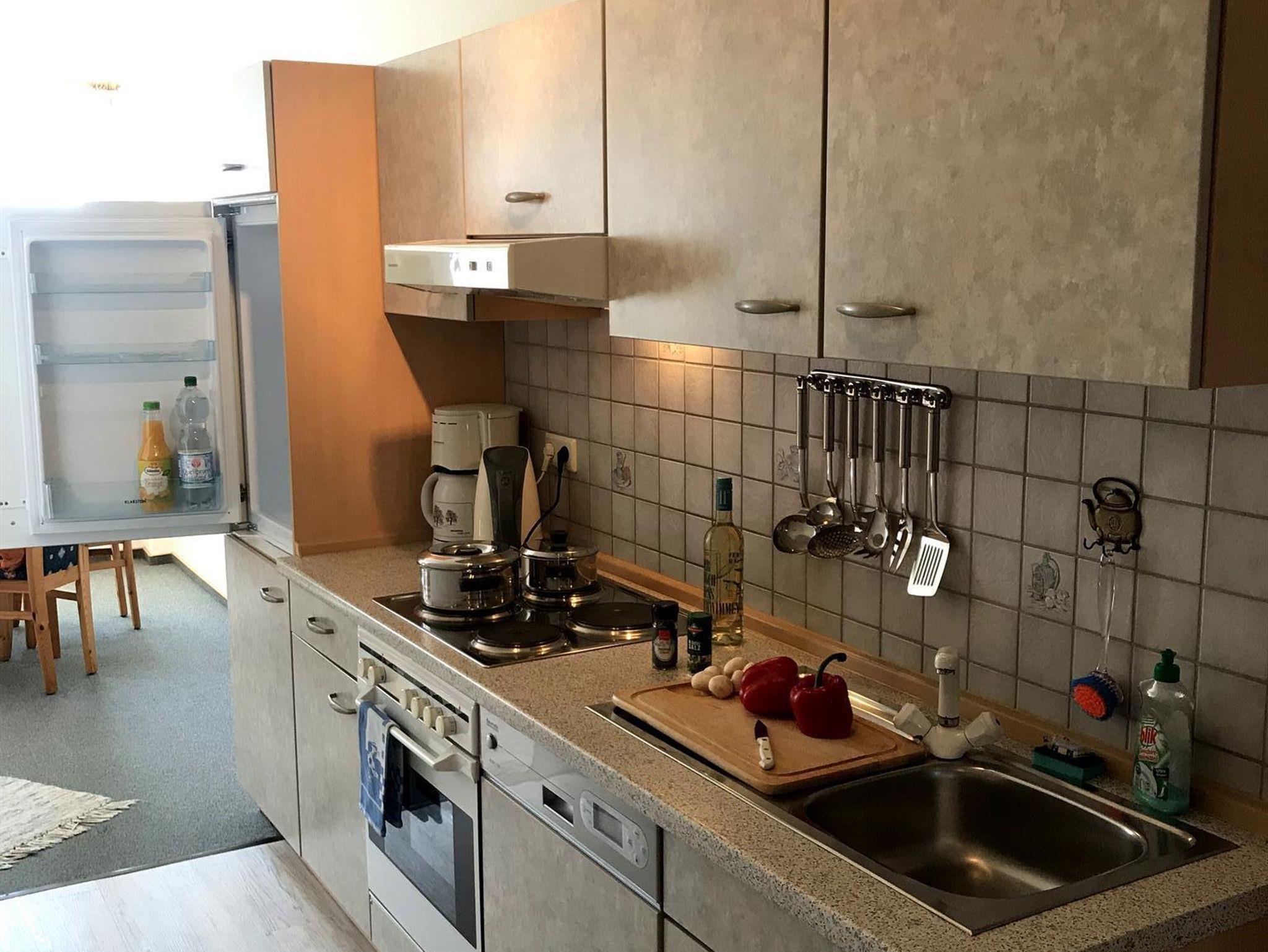 Die Ferienwohnung bietet 2 Schlafzimmer auf 50 qm, ein Duschbad und ein Großzügigen Wohn-, Koch- und Essbereich. Kinderbetten oder Zustellbetten lassen sich zusätzlich unterbringen. Die Küchenzeile ist komplett ausgestattet (Kühlschrank,Herd, Microwelle, Geschirrspühler, etc.). Sat-TV ist vorhanden. Waschmaschine und Wäschetrockner stehen bei Bedarf zur Verfügung.