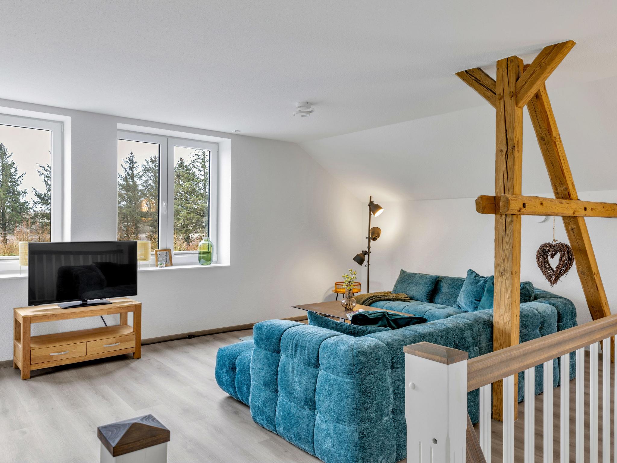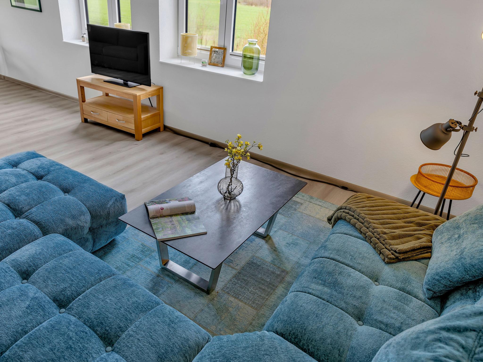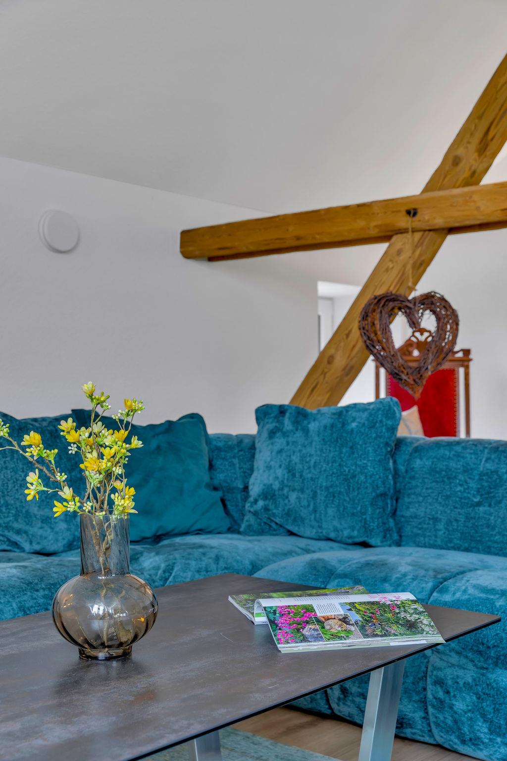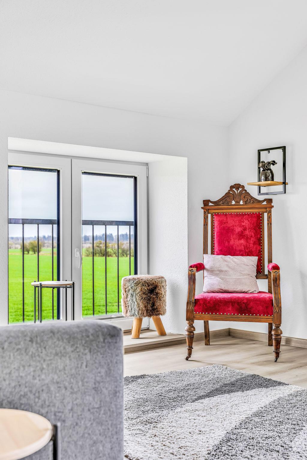 6-room apartment 150 m2 on 2 levels. Spacious, modern and tasteful furnishings: large dining room with dining table and cable TV (flat screen). 2 rooms, each room with 1 double bed (180 cm, length 200 cm). Large, open kitchen (oven, dishwasher, 4 ceramic glass hob hotplates, toaster, kettle, electric coffee machine). Shower/WC. Wood heating. Solar power. Upper floor: large living/sleeping room with 1 double sofabed (180 cm, length 200 cm), cable TV (flat screen). 1 room with 1 double bed (180 cm, length 200 cm). 1 room with 2 beds (90 cm, length 200 cm). Shower/WC. Comfortable furnishings in the country house style. Small terrace. Terrace furniture, barbecue, deck chairs. Beautiful panoramic view of the countryside. Facilities: washing machine, dryer, sauna. Internet (WiFi, free). Please note: non-smokers only. Maximum 2 pets/ dogs allowed. Bookings accepted for holiday purposes only.