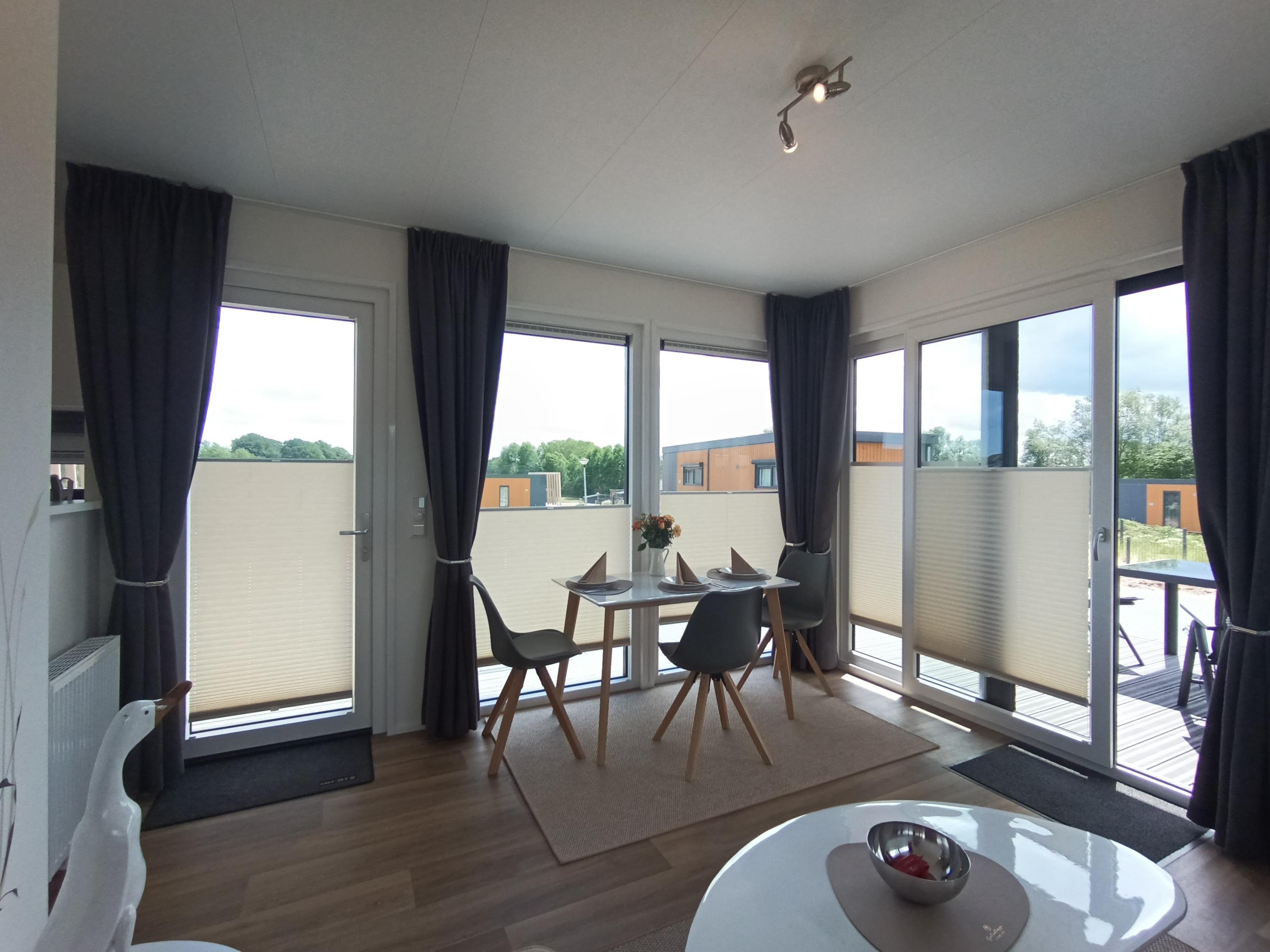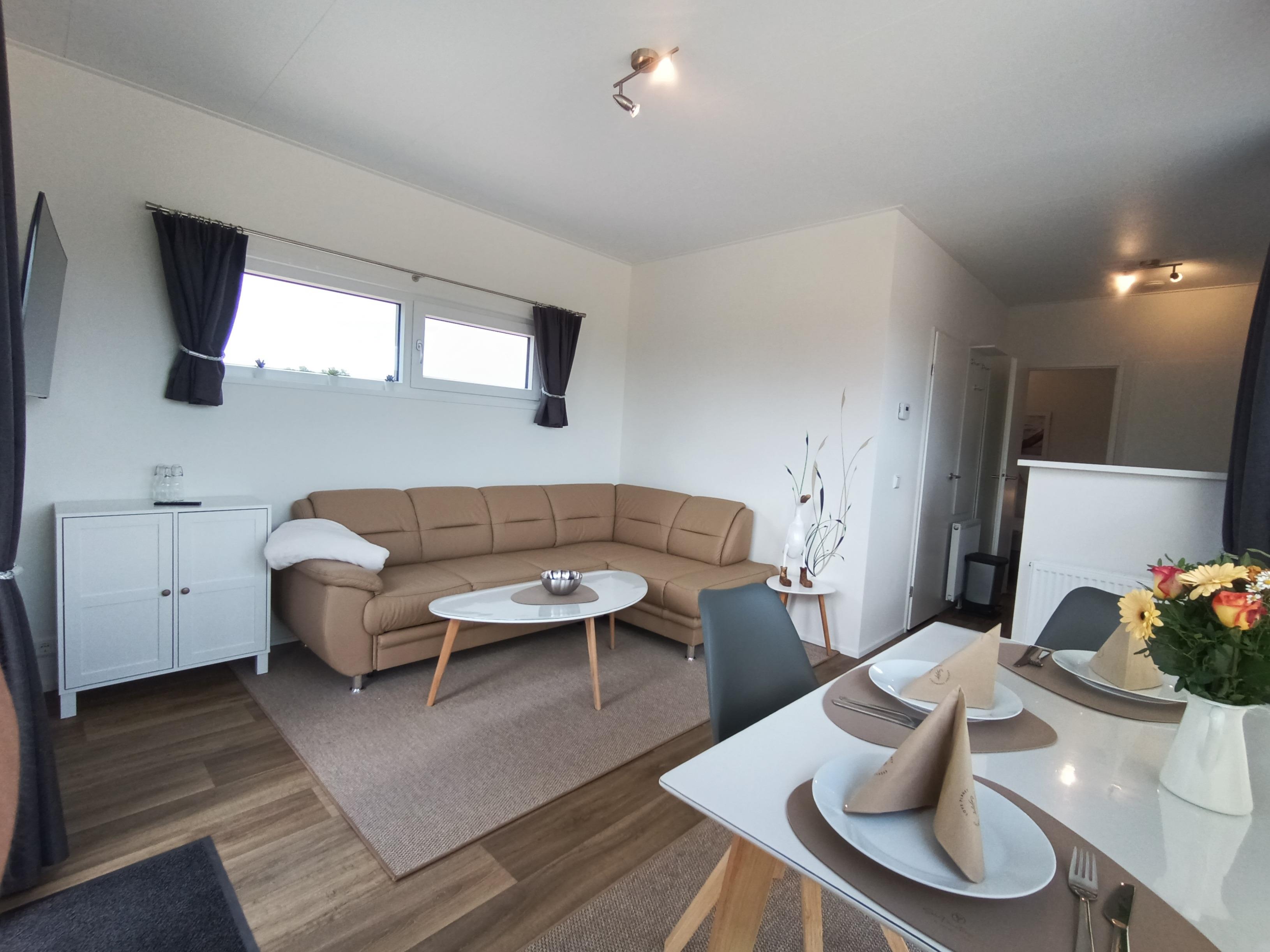 An allen Fenstern des Chalets finden sich Rolläden bzw. Plissees. Im Wohnbereich können Sie es sich auf dem hochwertigen Ledersofa bequem machen.