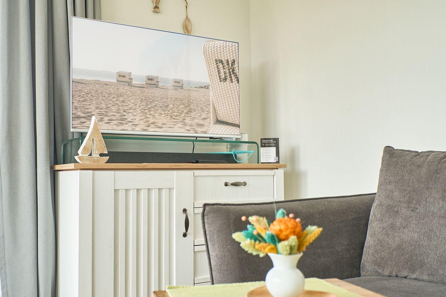 Die offene Küche ist zum Wohnzimmer hin gestaltet und bietet moderne Geräte wie Kühlschrank mit Gefrierfach, Backofen, Herd, Spülmaschine, Wasserkocher, Toaster und Kaffeemaschine. Auch an Küchenutensilien, Geschirr und Besteck sowie Geschirrhandtücher ist gedacht. Im Wohnbereich erwartet Sie eine gemütliche Sofaecke mit Sofa und ein Esstisch, an dem bis zu vier Personen bequem Platz finden. Für Unterhaltung stehen Ihnen ein Fernseher sowie kostenfreies WLAN zur Verfügung.