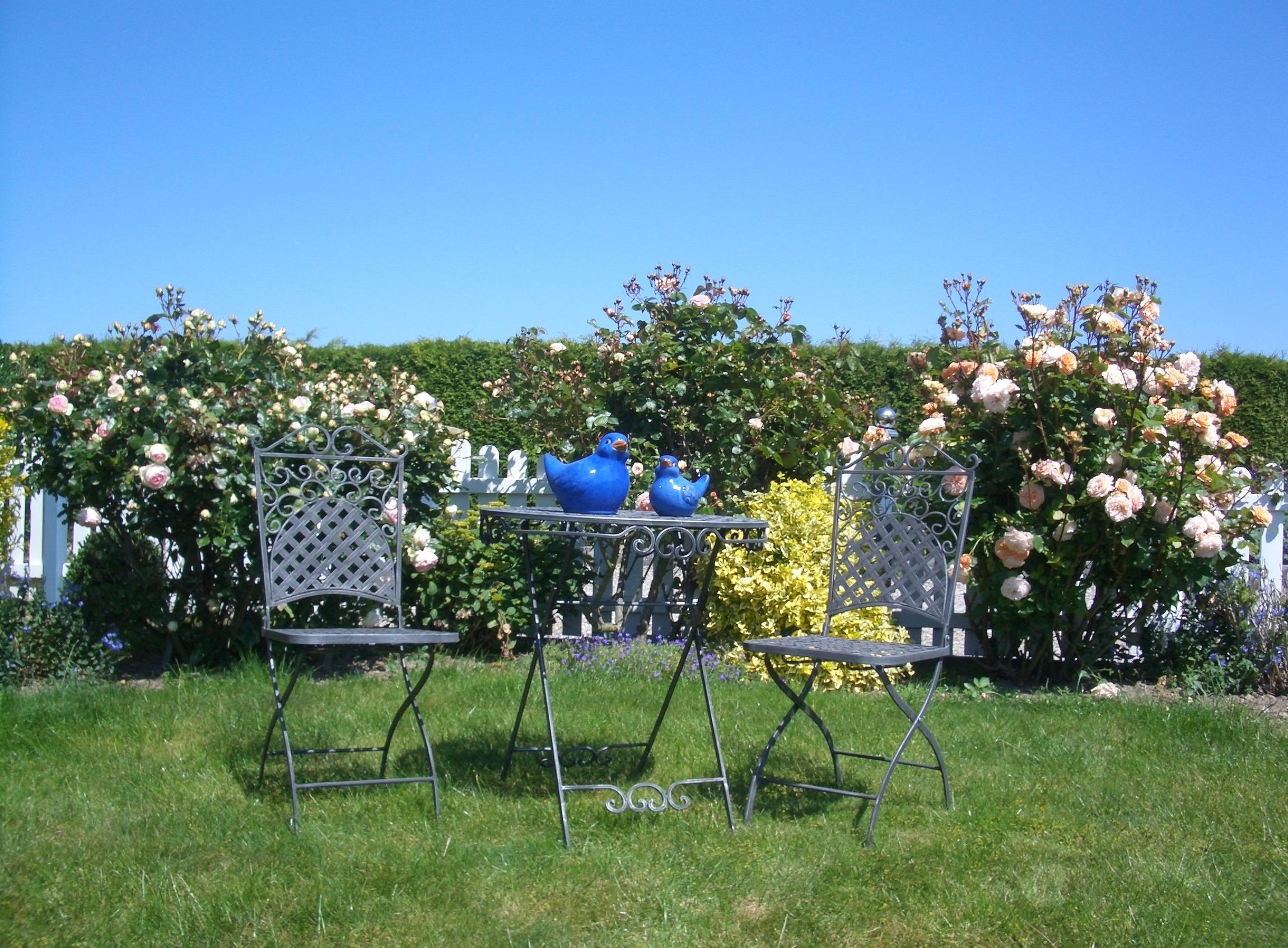 Die eigene und geschützte Terrasse befindet sich direkt an der Wohnung. Hier können Sie die Sonne bei einem Gläschen Wein bis zum Sonnenuntergang genießen. Aber auch zu allen anderen Gelegenheiten lässt man sich hier gern nieder. So hat man seine lieben Kleinen auch immer gut im Blick. Denn direkt vor der Haustür befindet sich die riesige Rasenfläche, umgeben von schönen Anpflanzungen, mit verschiedenen Spielgeräten. Ein Gartenhaus mit Gartenmöbeln, Sitzauflagen, Liegen, Sonnenschirm und einem Grill steht Ihnen auch zur Verfügung.