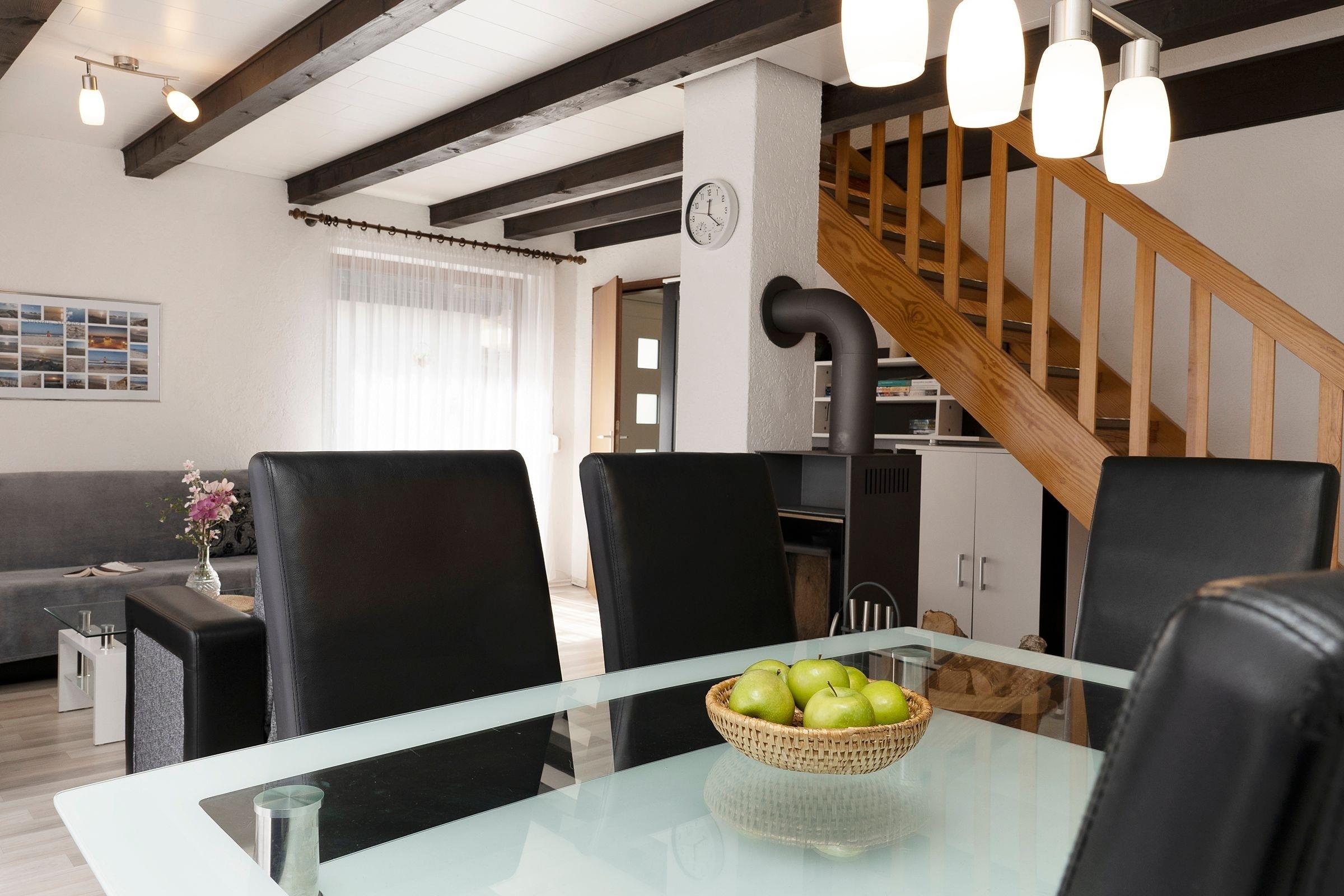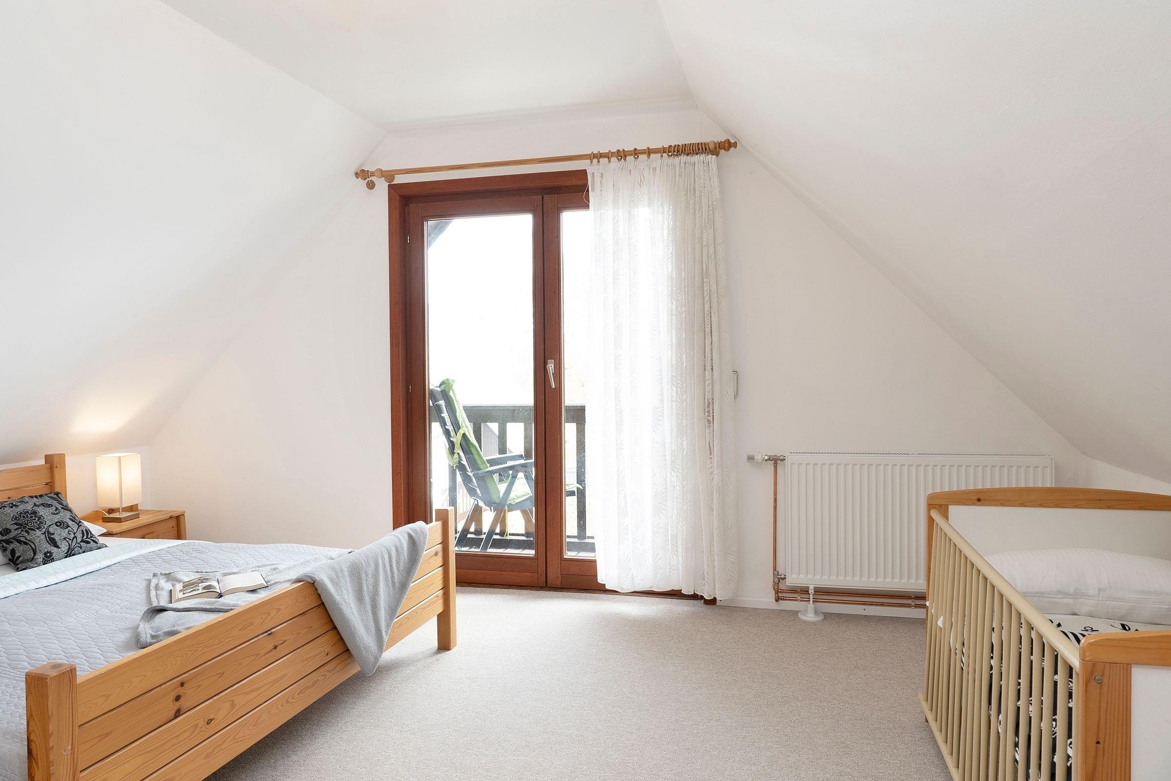 Von dem modernen Wohn-/Esszimmer aus erreichen Sie die sonnige Terrasse vor dem Haus. Das moderne Badezimmer besticht durch eine Dusche mit flachem Einstieg und heller Badkeramik. Vom Wohnzimmer aus, das Sie mit einem gusseisernen Ofen empfängt, geht es hinauf zu den zwei Schlafräumen. Das Schlafzimmer mit gemütlichem Doppelbett (2x 90x200 cm) sorgt für erholsamen Schlaf. Der zweite Schlafraum ist mit zwei Einzelbetten (je 90x200 cm) und einem Flachbildfernseher mit integriertem DVD-Player (kein Fernsehempfang) ausgestattet. Ein Kinderbett sowie ein weiteres Zustellbett sorgen für weitere Schlafmöglichkeiten.