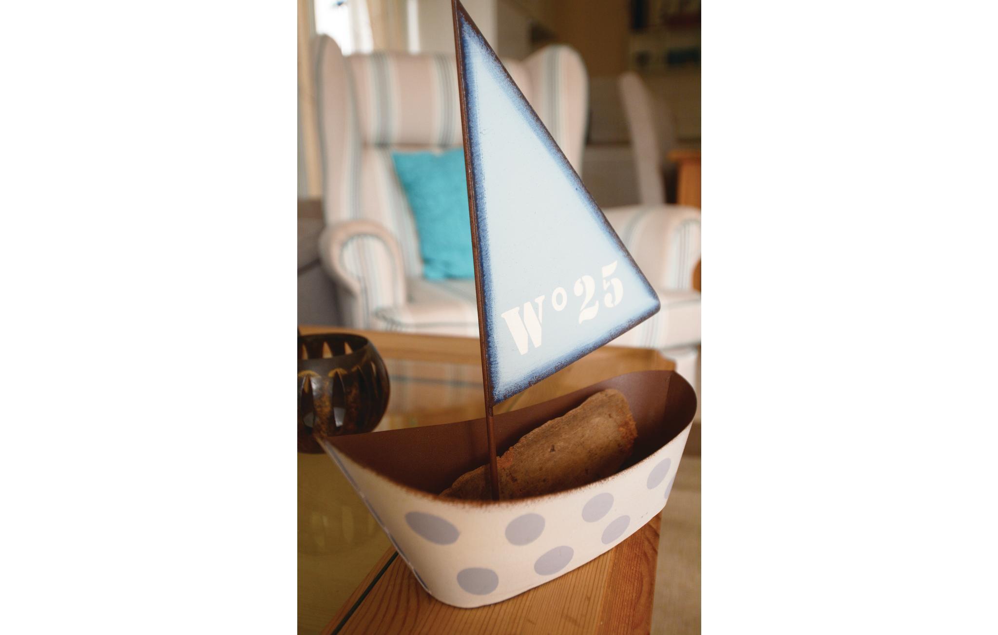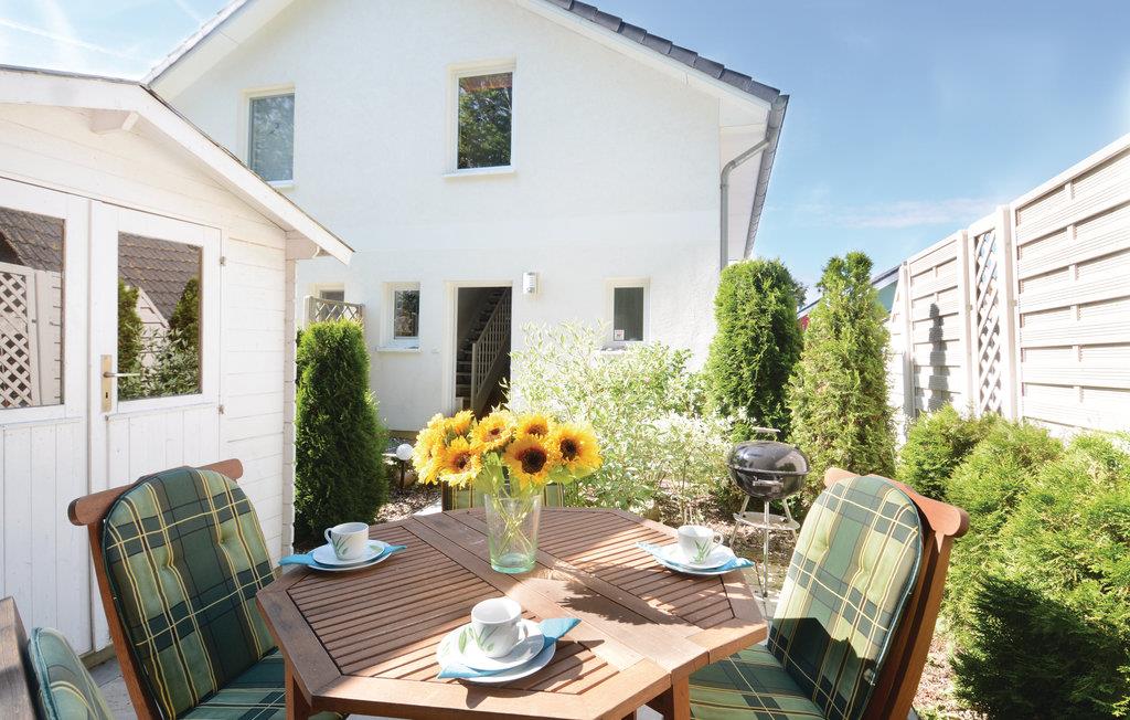 Husets møblerede og delvist overdækkede terrasse vender mod syd. Bag huset er der også havemøbler, grill og et havehus til cykler og fiskeudstyr, for der er meget gode fiskemuligheder på Süssauer Strand.