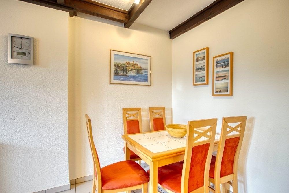 Das Appartement verfügt über zwei Schlafzimmer im Obergeschoss (Doppelbett sowie zwei Einzelbetten), ein Wohnzimmer im Erdgeschoss mit Schlafcouch, Esstisch und TV sowie eine voll ausgestattete Küche mit Backofen, Ceranfeld und Kaffeemaschine. Ein Duschbad befindet sich ebenfalls im Erdgeschoss. Die Terrasse ist direkt vom Wohnbereich aus zugänglich.