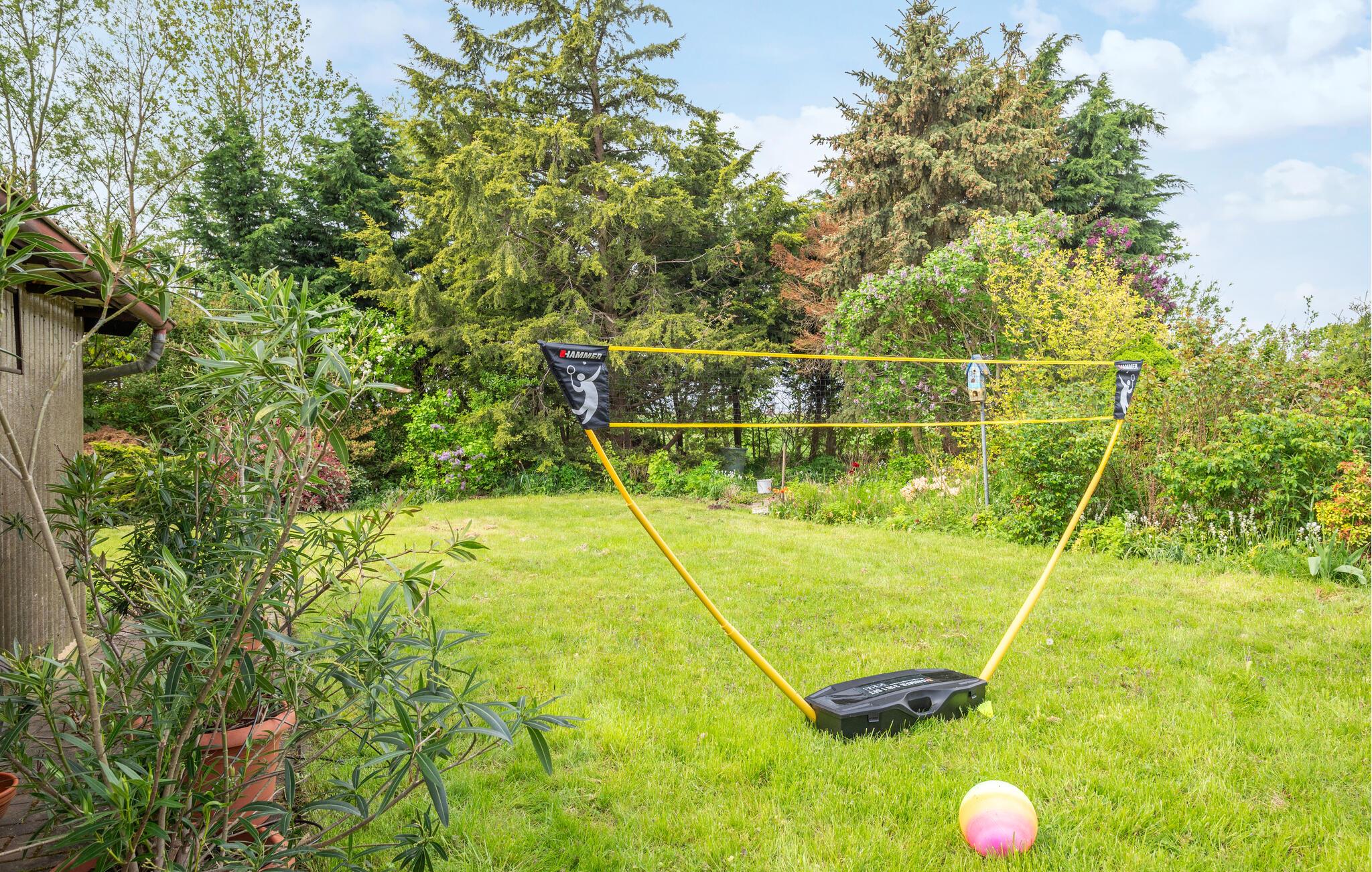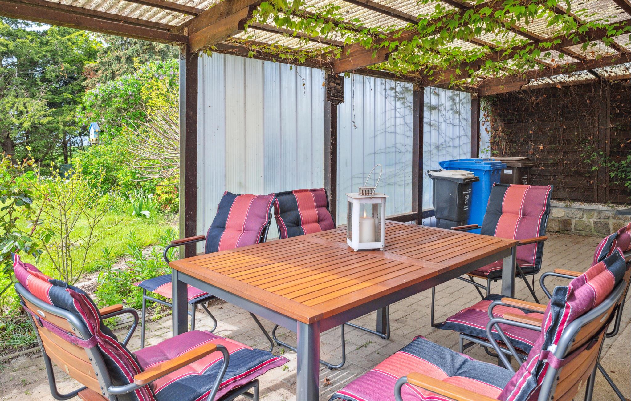 Til huset hører en skøn, overdækket terrasse, der er flot dekoreret med planter, og hvor I kan nyde morgenkaffen uanset vejret. I haven er der godt med plads og fine legeredskaber til børnene, og hvis vejret er godt ud på eftermiddagen, kan I fyre op i grillen og servere gode bøffer og spyd under den lune aftensol.