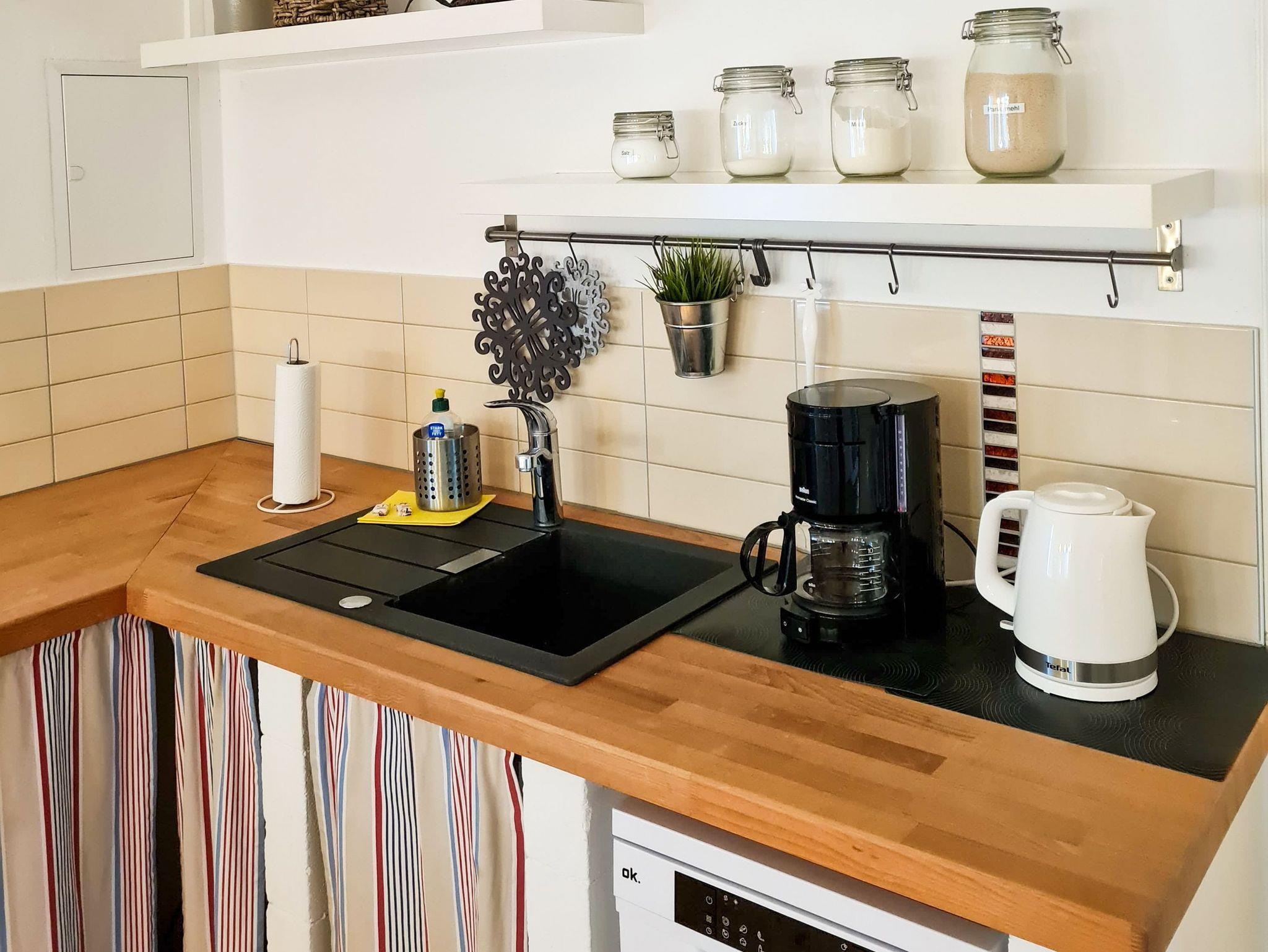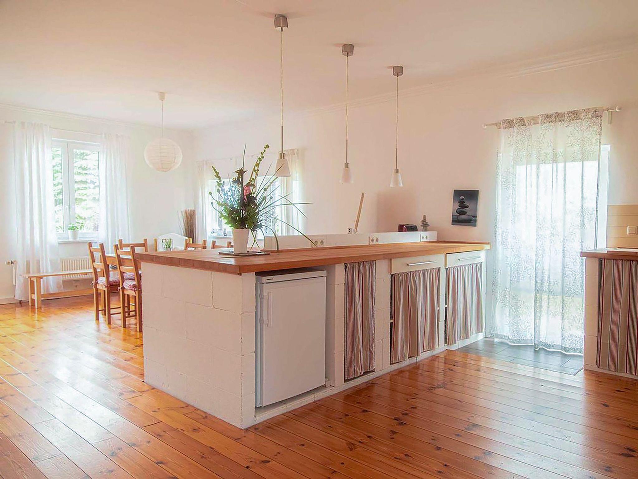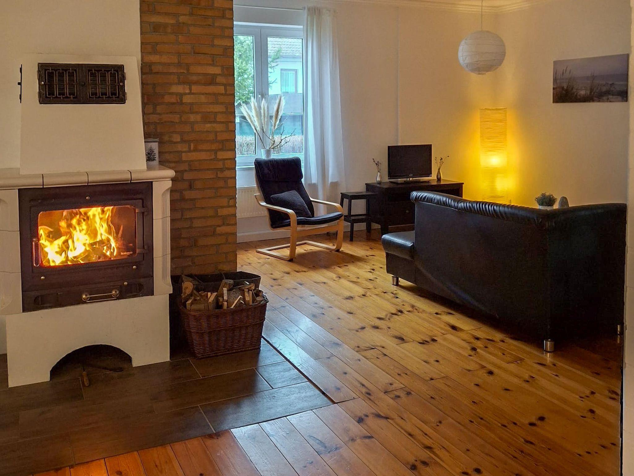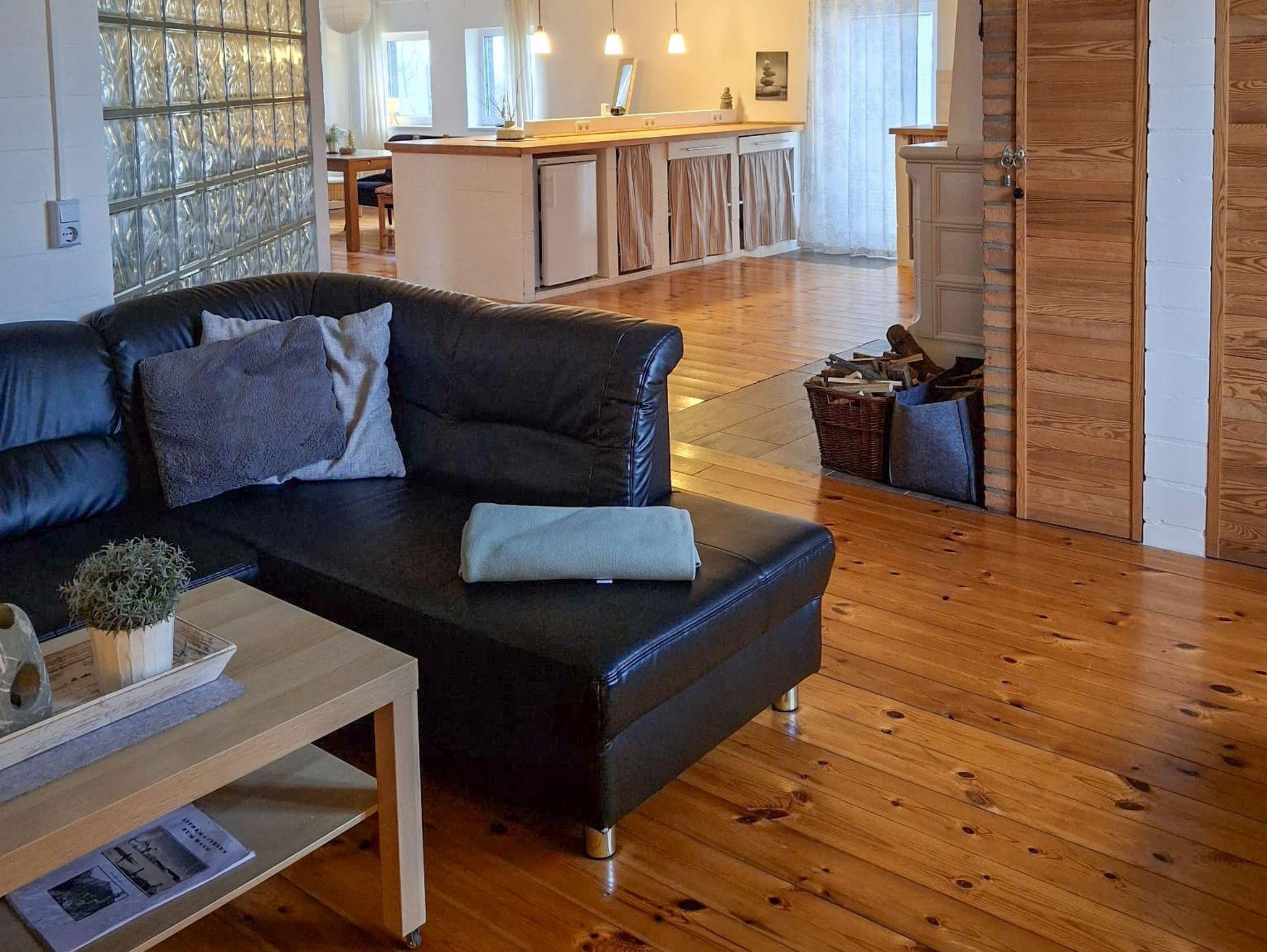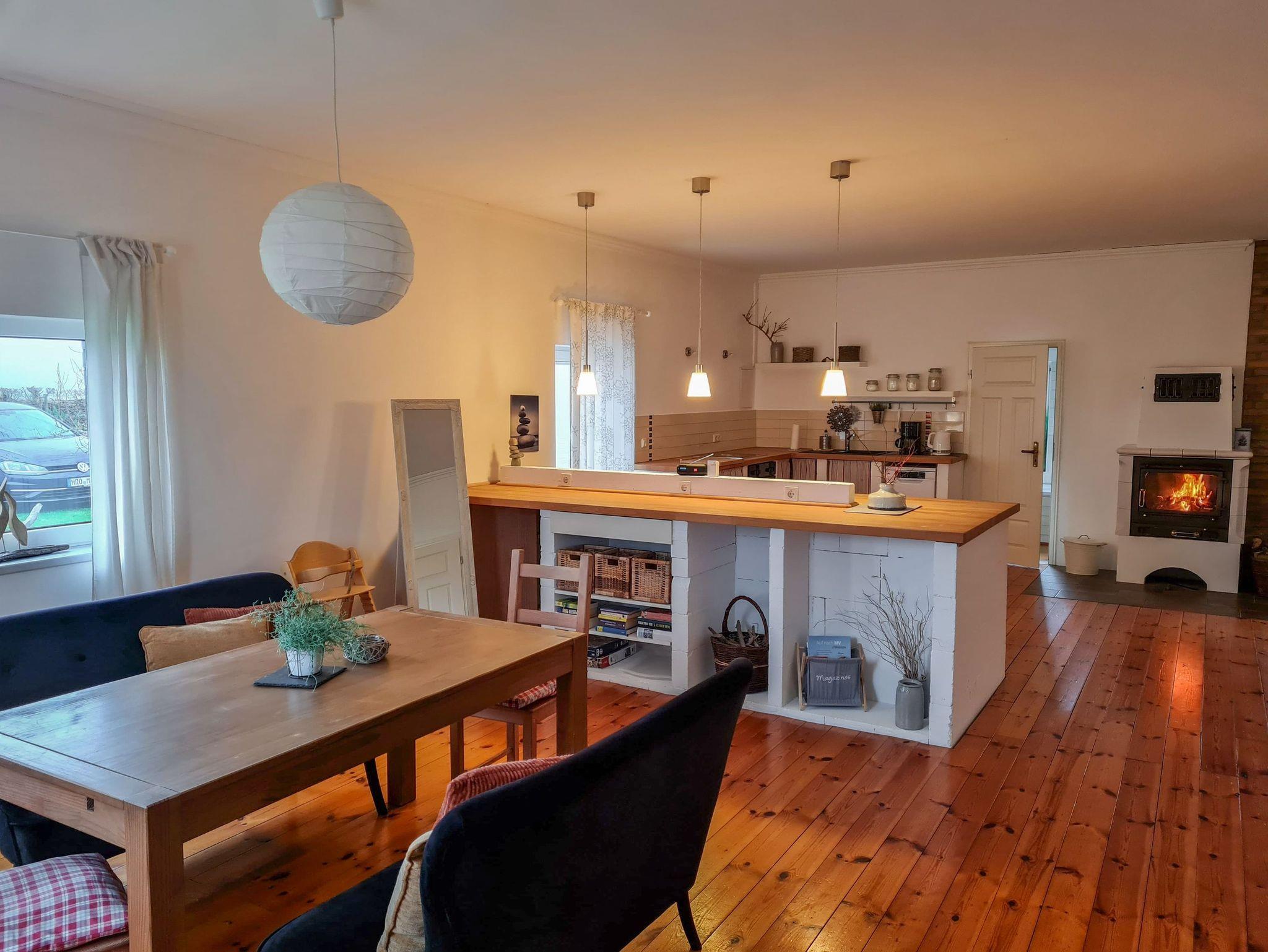 Das Ferienhaus Bollhagen bietet auf 80 m² ausreichend Platz für 5 Personen. Ebenerdig und mit warmem Dielenfußboden ausgestattet, strahlt es sofort Gemütlichkeit aus. Im großen Wohnbereich kannst du es dir so richtig gut gehen lassen: Auf dem bequemen Ledersofa relaxen, den TV einschalten oder am Kamin die Seele baumeln lassen ? das Holz liegt natürlich schon für dich bereit. Die offene Küche mit Kücheninsel macht das Kochen zum Vergnügen. Hier findest du alles, was du brauchst: einen Backofen, Herd, Kühlschrank mit Gefrierfach, Spülmaschine, Mikrowelle, Toaster, Wasserkocher und Kaffeemaschine. Am großen Esstisch ist genug Platz, um zusammen zu schlemmen und den Tag zu planen. Im ersten Schlafzimmer gibt es ein Doppelbett (180x200) und ein Einzelbett (90x200), perfekt für Familien oder Freunde. Im zweiten Schlafzimmer wartet ein weiteres Doppelbett (180x200) auf dich ? und als Highlight eine Glaswand, durch die du das beruhigende Flackern des Kaminfeuers sehen kannst. Das ist Urlaubsfeeling pur! Das Tageslichtbad ist modern und praktisch zugleich: Ob schnelle Dusche oder entspanntes Bad, hier hast du die Wahl. Auf der großen Terrasse kannst du die Morgensonne genießen, gemütlich frühstücken oder den Tag entspannt ausklingen lassen. Die weitläufige Grünfläche lädt zum Sonnenbaden auf den Liegestühlen ein und mit dem Grill und der Feuerschale steht auch einem gemütlichen Abend nichts im Weg. Für Spaß und Abwechslung gibt es außerdem Spiele für Groß und Klein ? da kommt garantiert keine Langeweile auf.