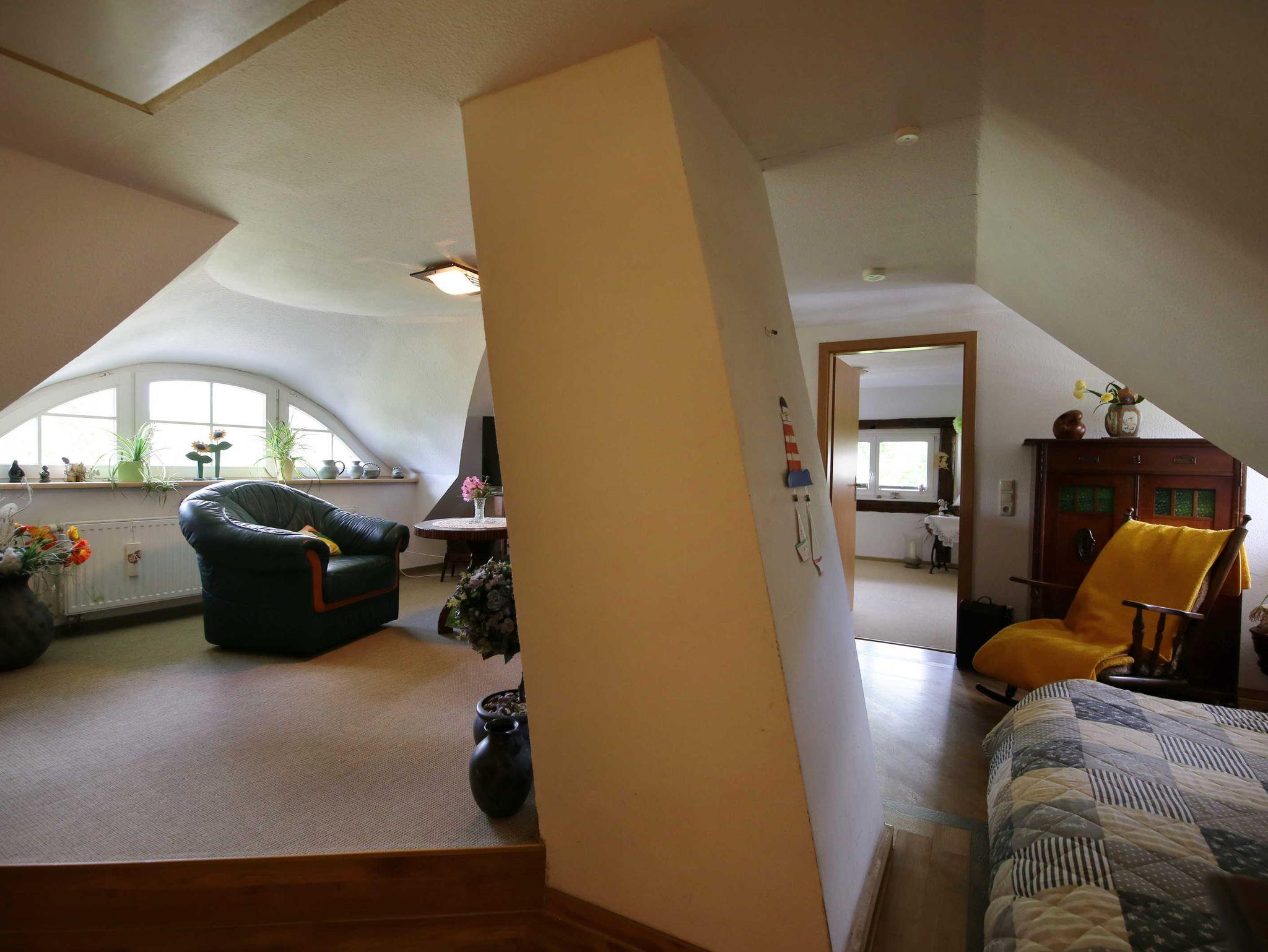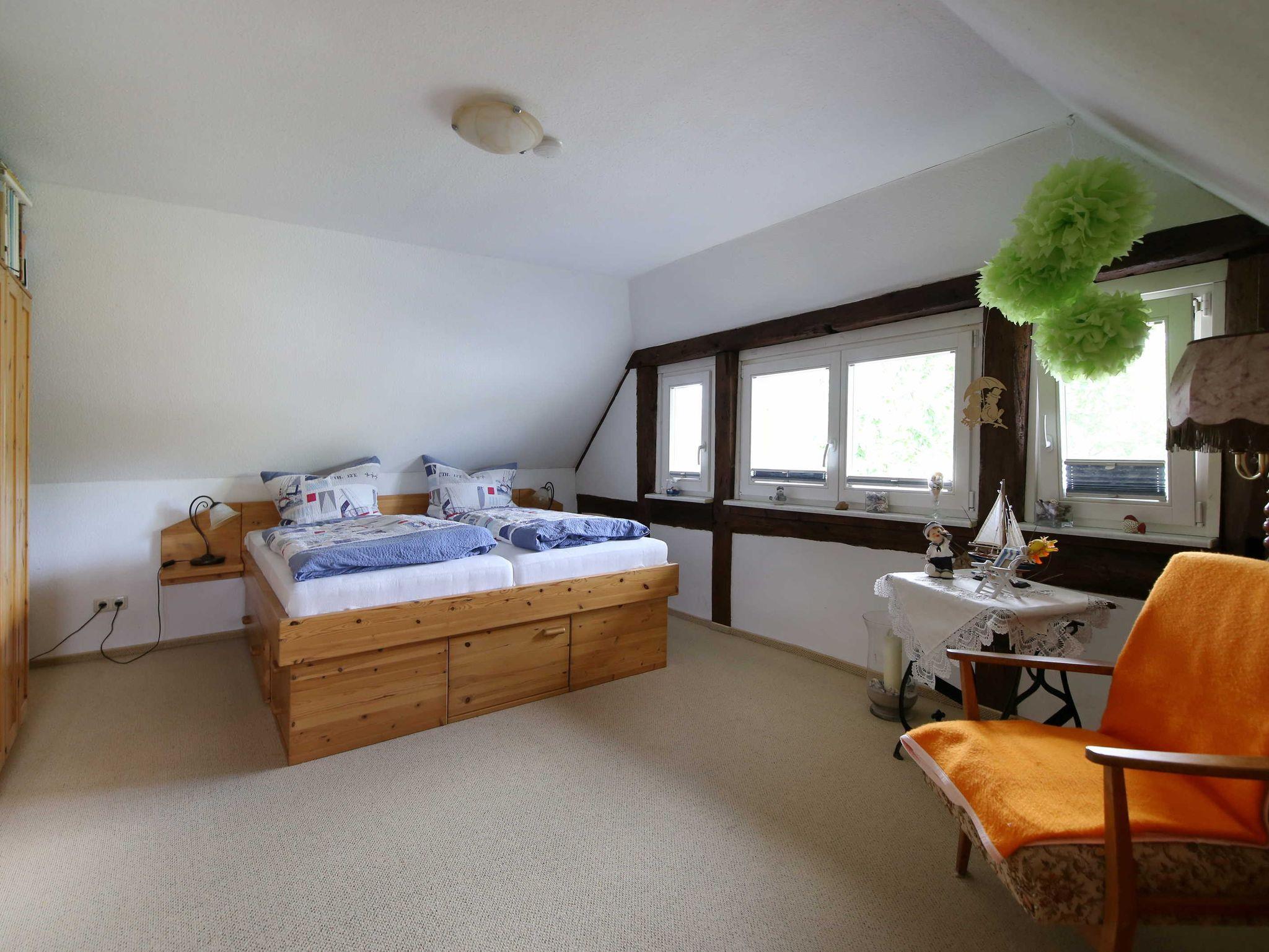 Die Ferienwohnung im Obergeschoss ist komfortabel ausgestattet und hat einen separaten Eingang. Auf ca. 90 qm befinden sich Schlaf- und Wohnraum. Eine offene Küche und Aufbettungsmöglichkeit sowie ein Badezimmer. Der Garten kann mitgenutzt werden.