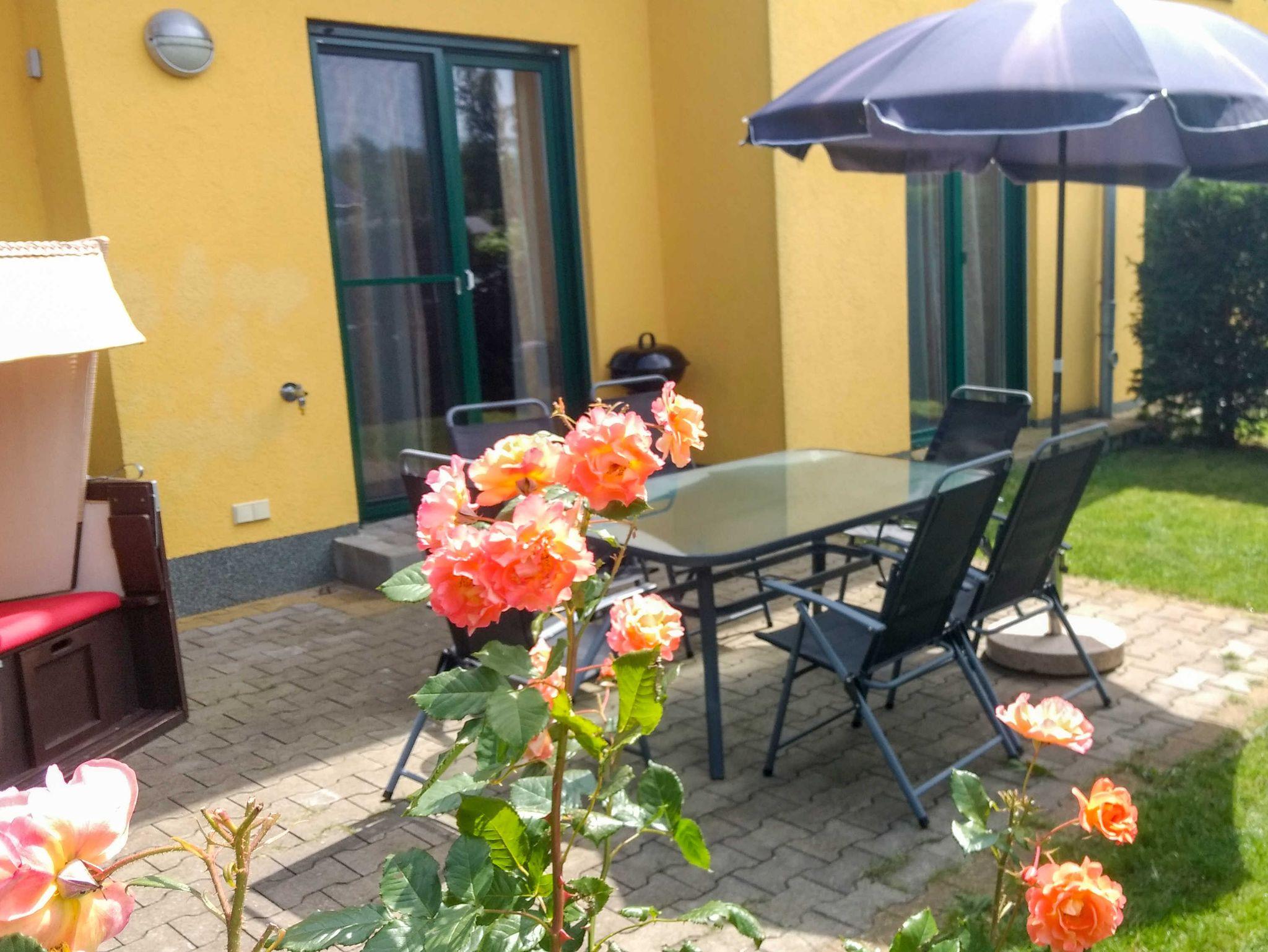 Im Außenbereich steht Ihnen eine schöne große Terrasse mit Gartenmöbeln, Sonnenliegen und einem eigenen Strandkorb zur Verfügung.