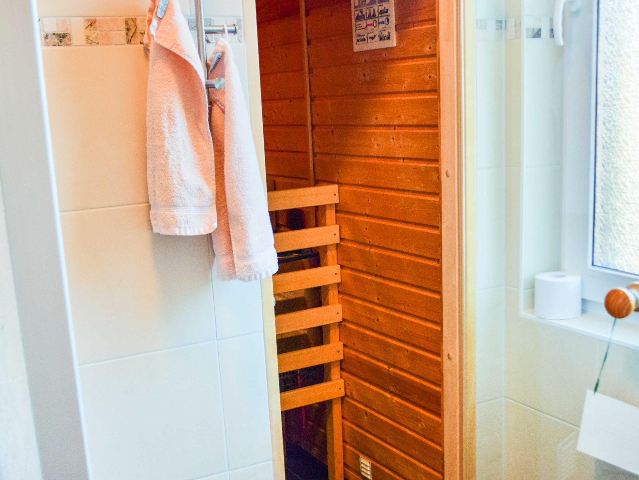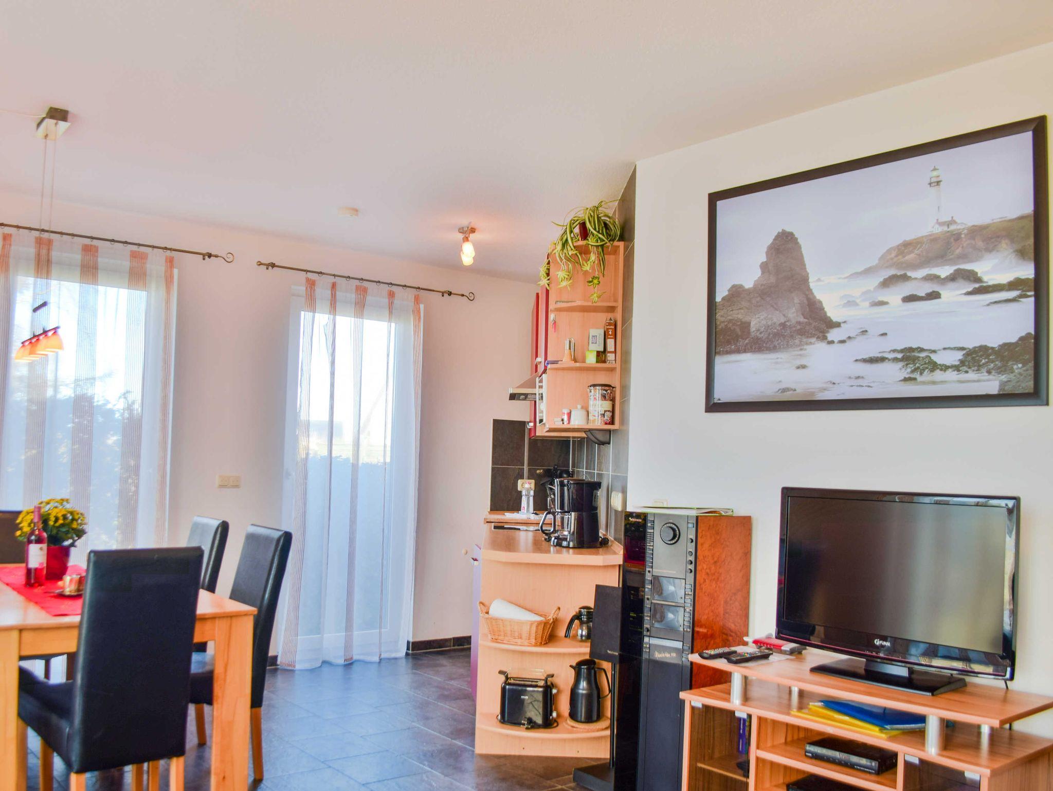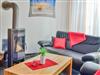 Die geschmackvoll eingerichtete Doppelhaushälfte für 6 Personen hat einen separaten Eingang und besitzt ein Wohnzimmer mit Kamin und offener Küche, sowie einen Essbereich und elektrische Rollläden im Erdgeschoss. Die Küche ist komplett ausgestattet mit Geschirr, Gläsern, Besteck, Töpfen, Pfannen, Backofen mit Backblech, Herd mit 4 Cerankochfeldern, Kühlschrank (92l) mit Tiefkühlfach (33l), Mikrowelle, Geschirrspüler, Toaster, Wasserkocher und Kaffeemaschine. Des Weiteren gehören zwei 2 Bäder zum Ferienhaus, eines mit Dusche, WC und Sauna, das andere mit Badewanne und WC, sowie 3 Schlafzimmer, zwei mit jeweils einem Doppelbett (180x200) und eines mit einem Schlafboden (140x200), welches über eine steile Raumspartreppe erreichbar ist.