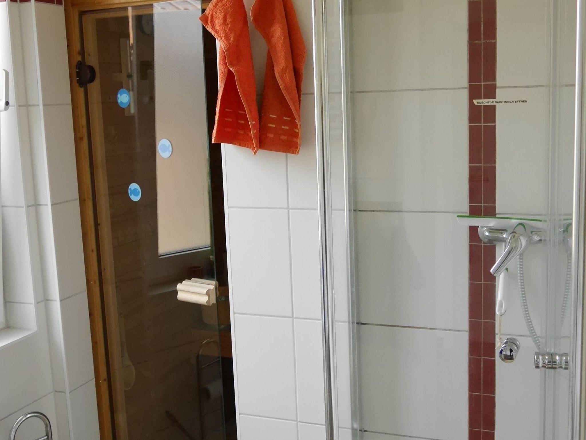 Weiterhin befindet sich dort ein Badezimmer mit Toilette und Dusche sowie einer Sauna.