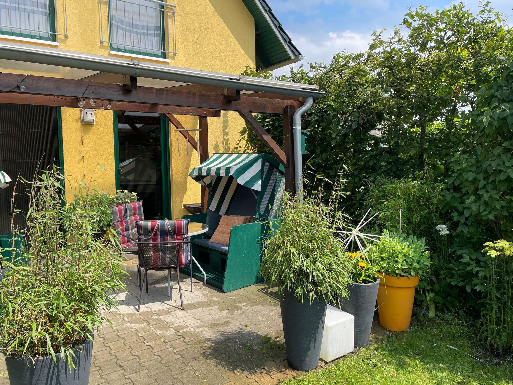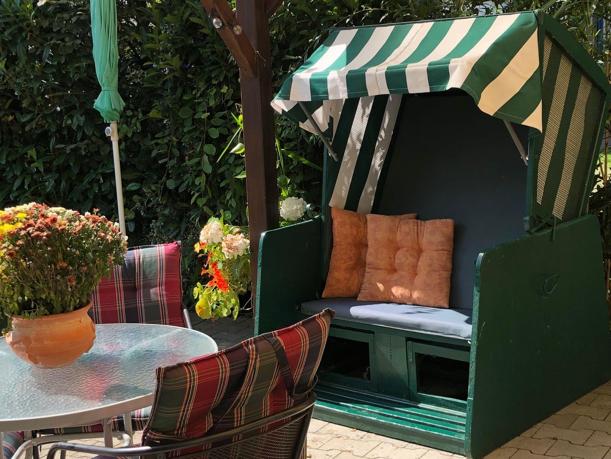 In unserer Außenanlage finden Sie eine überdachte Terrasse mit diversen Sitzmöglichkeiten, Sonnenliegen und Strandkörben.