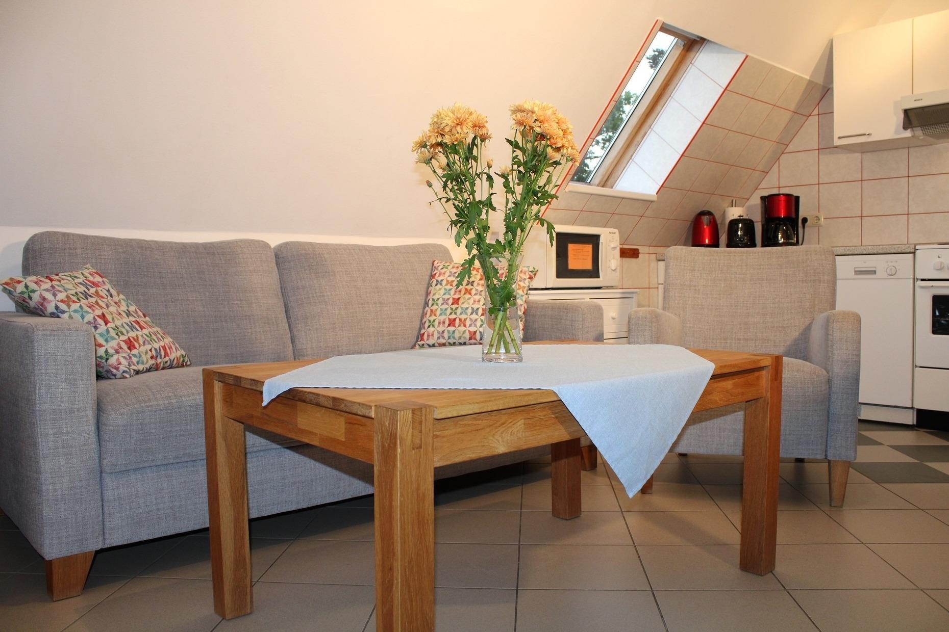 Im zur Spielstraße gerichtetem Hauptbefinden sich 4 Ferienwohnungen mit moderner und solider Ausstattung. Sie sind jeweils ca. 35 (30) m² groß. Jede Wohnung verfügt über ein separates Schlafzimmer, Bad mit WC und Dusche bzw. Badewanne. Im Wohnbereich ist jeweils eine Küchenzeile, bzw. Pantry-Küche integriert. Alle Wohnungen haben, Sat-TV, Telefon, W-Lan-Empfang und Nachtspeicherheizung.