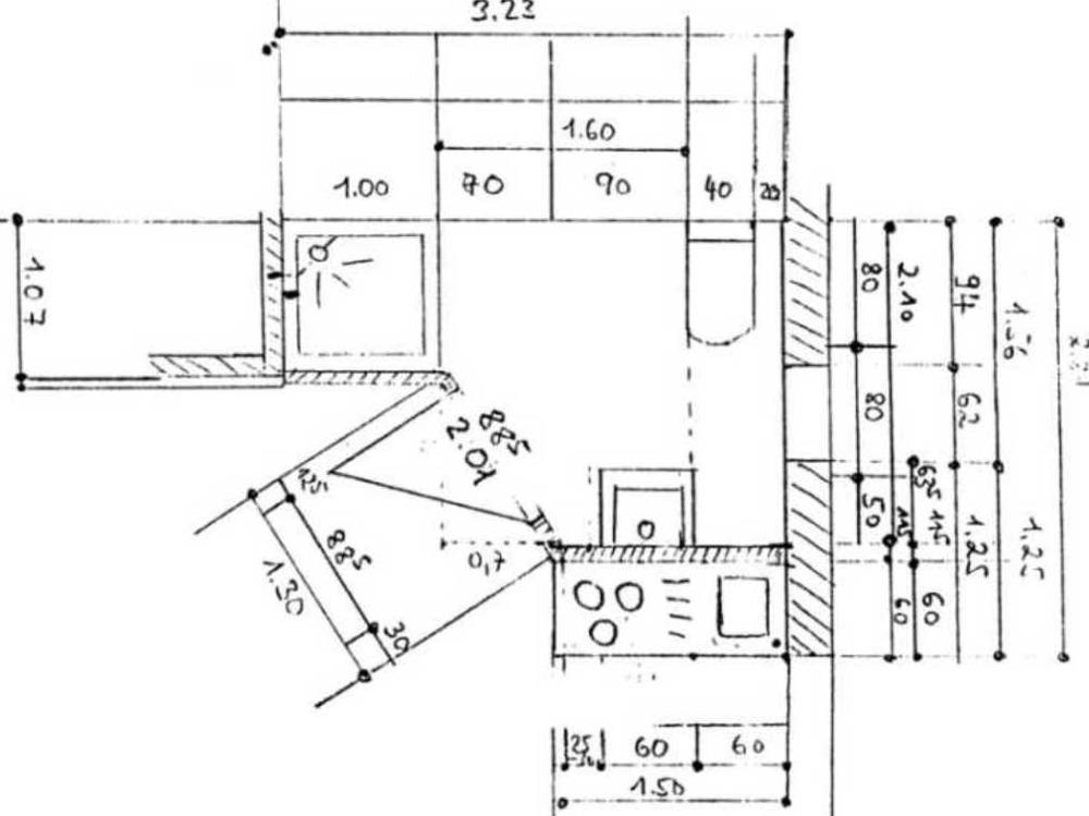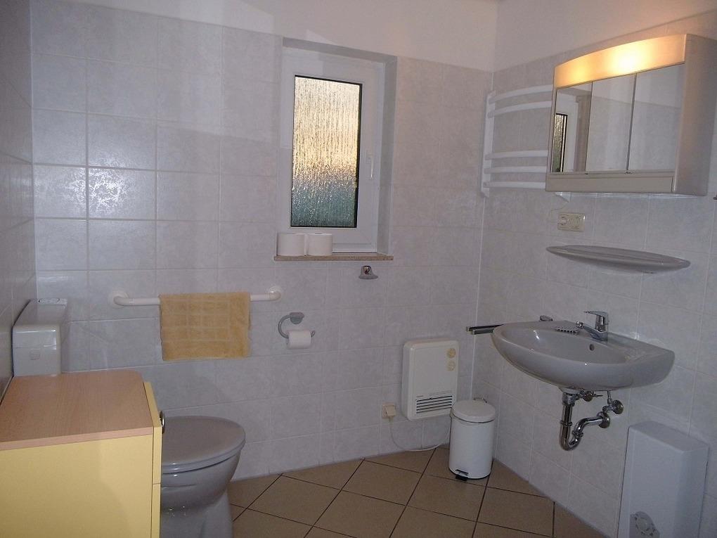 Im Bad wurde versucht die Bedürfnisse von Rollstuhlfahren zu berücksichtigen. Das Badezimmer besteht aus einer ebenerdigen Dusche (0, 90 x 0, 90 m) mit Duschhocker und Haltegriffen, Toilette und Waschbecken