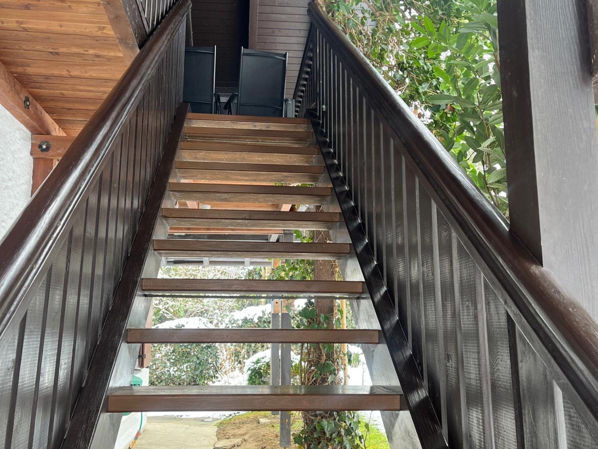 Der Balkon ist mit Tisch und Stühlen ausgetattet und bietet eine nette Sitzgelegenheit an der frischen Luft.