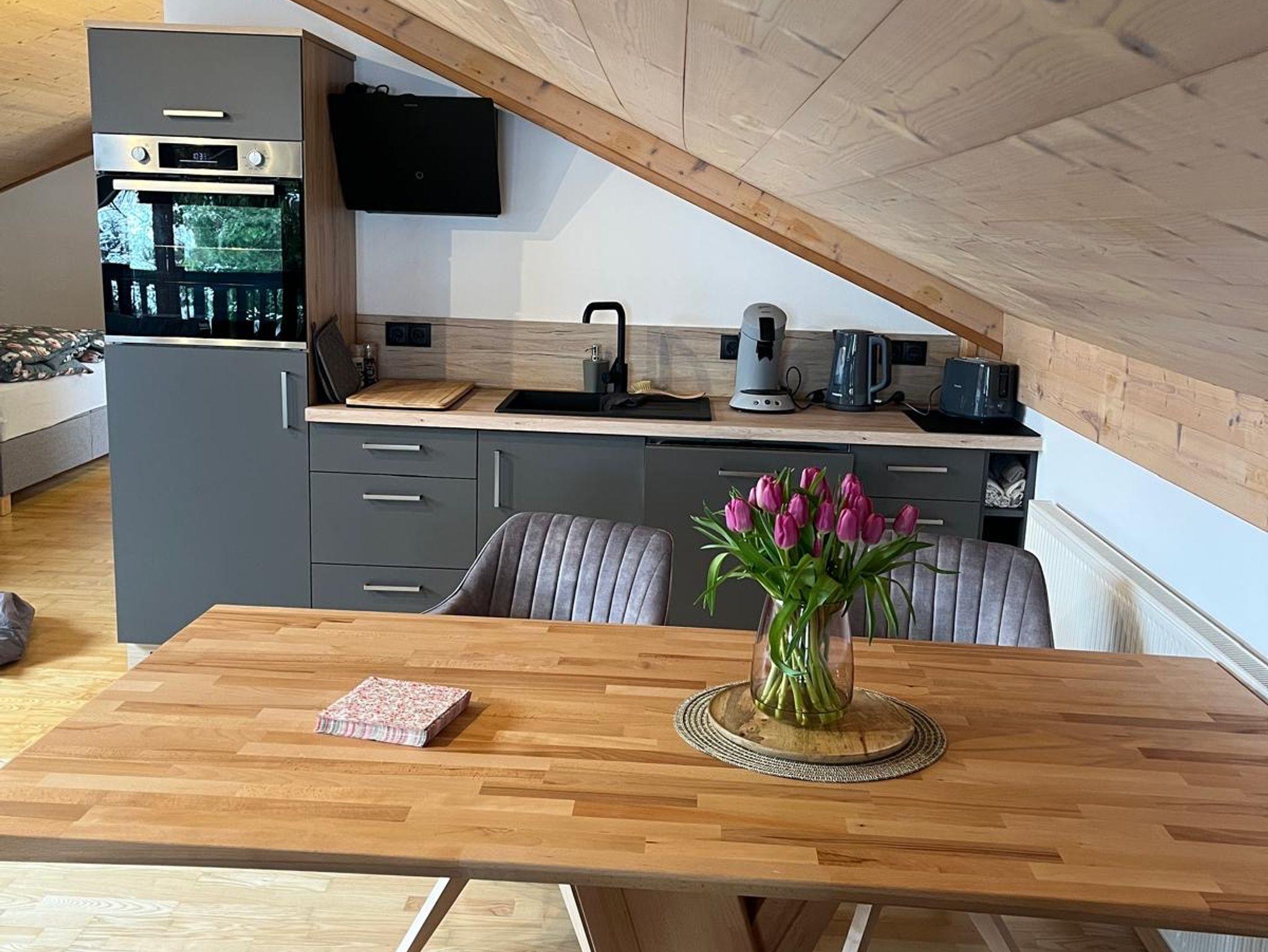 Das Apartment Watzmannblick in Sillersdorf bietet auf 48m² Platz für 2 Erwachsene und 2 Kinder. Es befindet sich im ersten Stock (Dachgeschoss) einer Landhausvilla mit separatem Außenaufgang. Es verfügt über eine gut ausgestattete Küchenzeile, einen großen Esstisch, einen Wohn- und Schlafbereich mit Doppelbett und Couch. Die Couch wird bei Belegung mit max. 2 Kindern zu einer Schlafcouch umfunktioniert. Das sehr helle Badezimmer ist mit Dusche, WC, Waschbecken und Fön ausgestattet. Es gibt ein separates, großzügiges Ankleidezimmer mit 2 offenen Kleiderschränken und ausreichend Platz für Koffer, Taschen oder Kinderwagen...