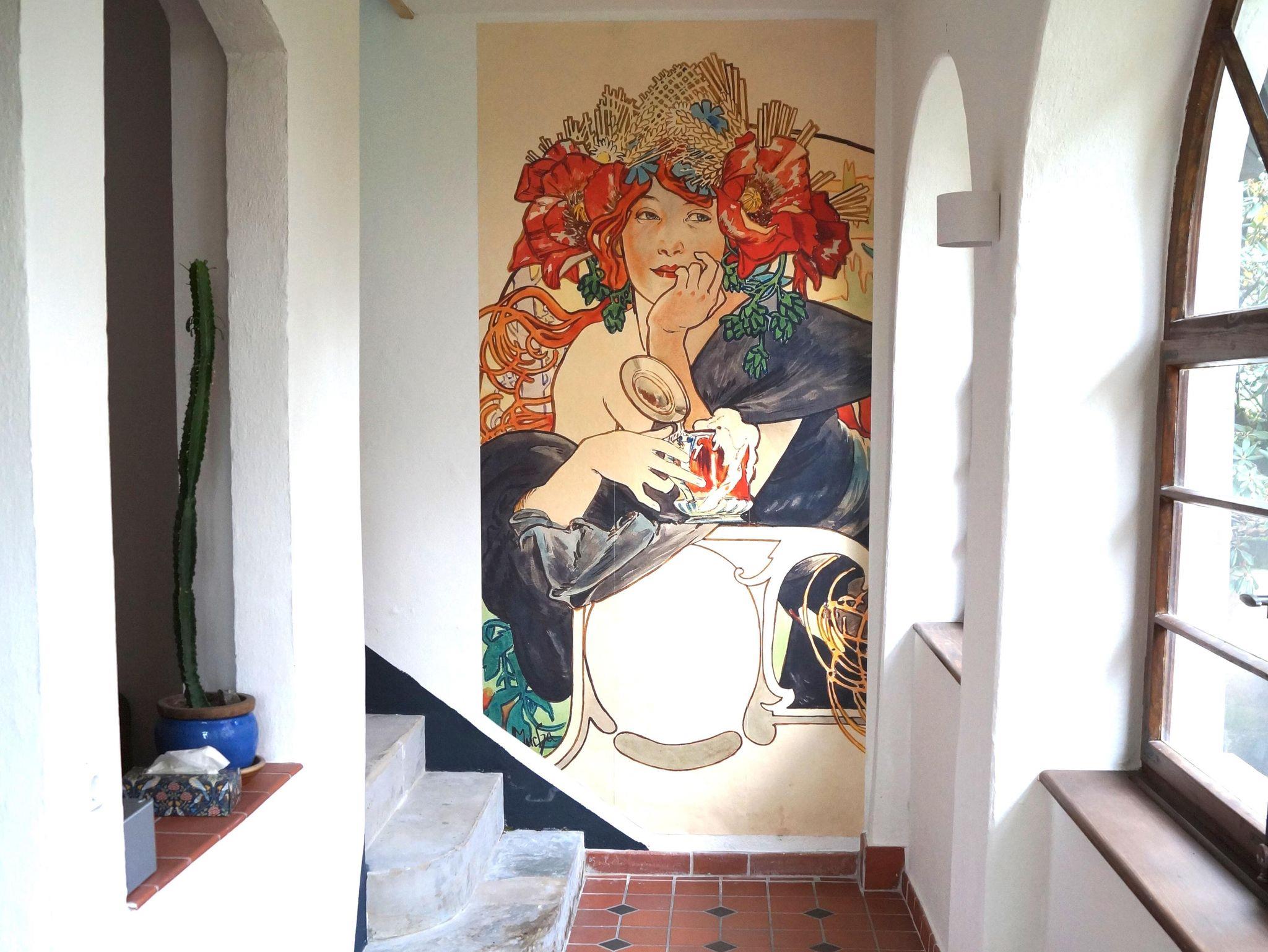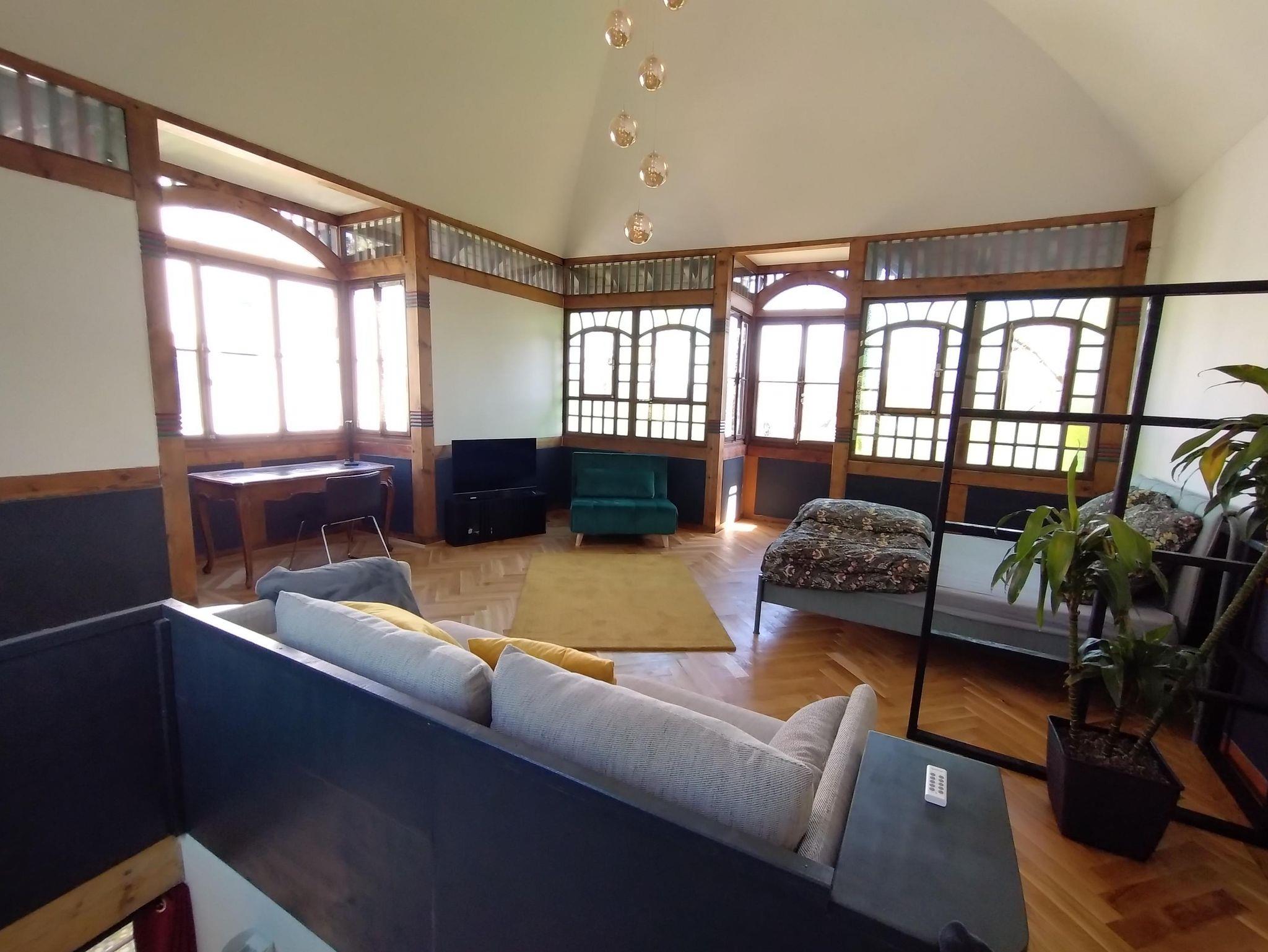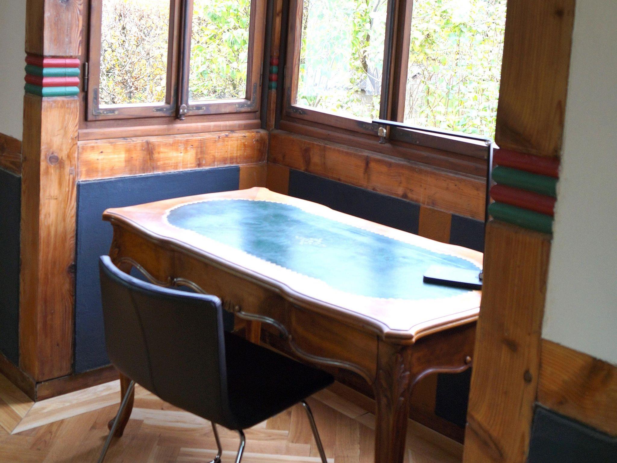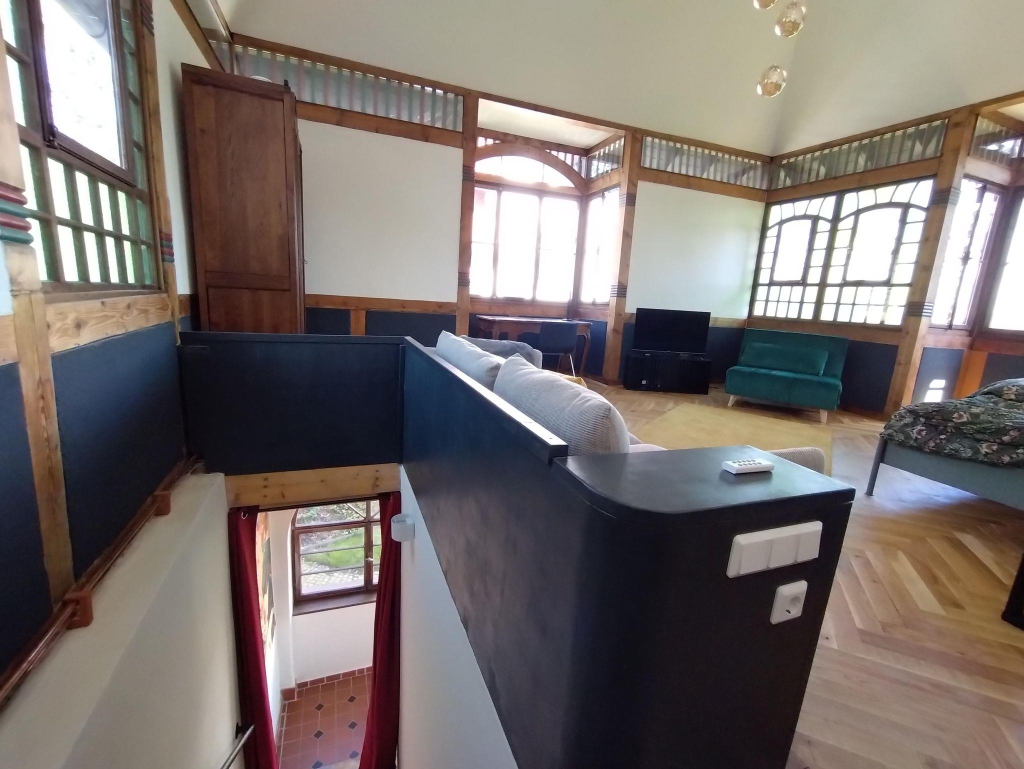 In der oberen Etage liegt der Schlaf- und Arbeitsbereich. Ausgestattet ist dieser Raum mit einer Couch, einem Doppelbett (1,6 m Breite), einem Schlafsessel, einem Kleiderschrank, einem Schreibtisch sowie einem Fernseher. W-Lan steht zur Verfügung.