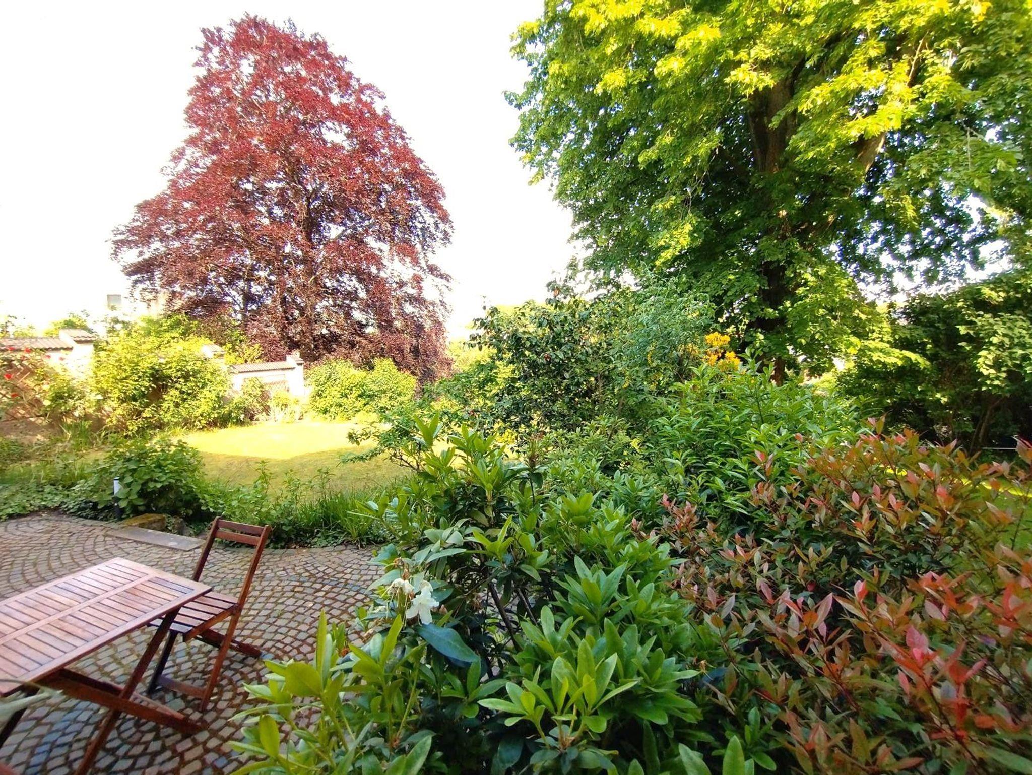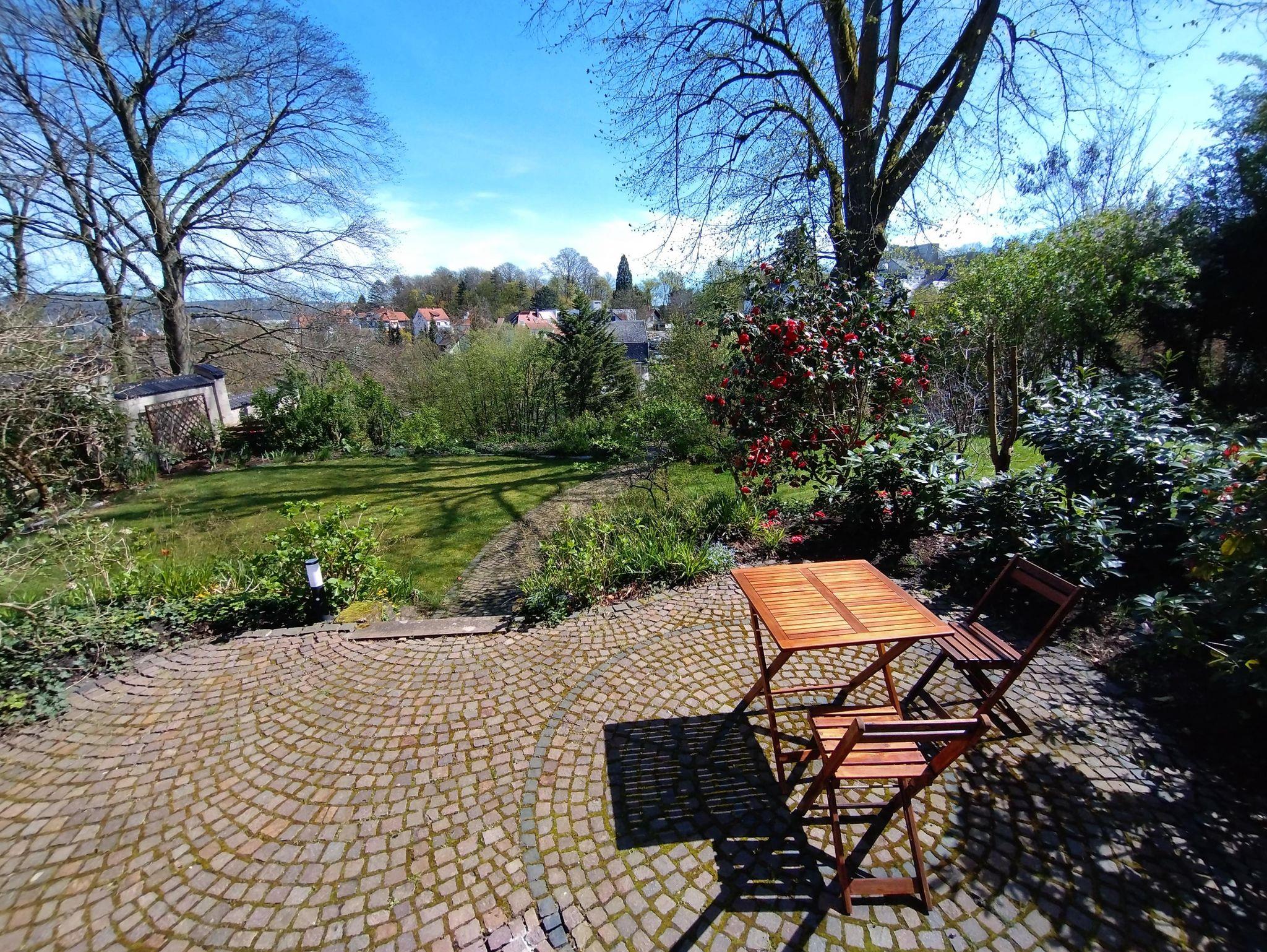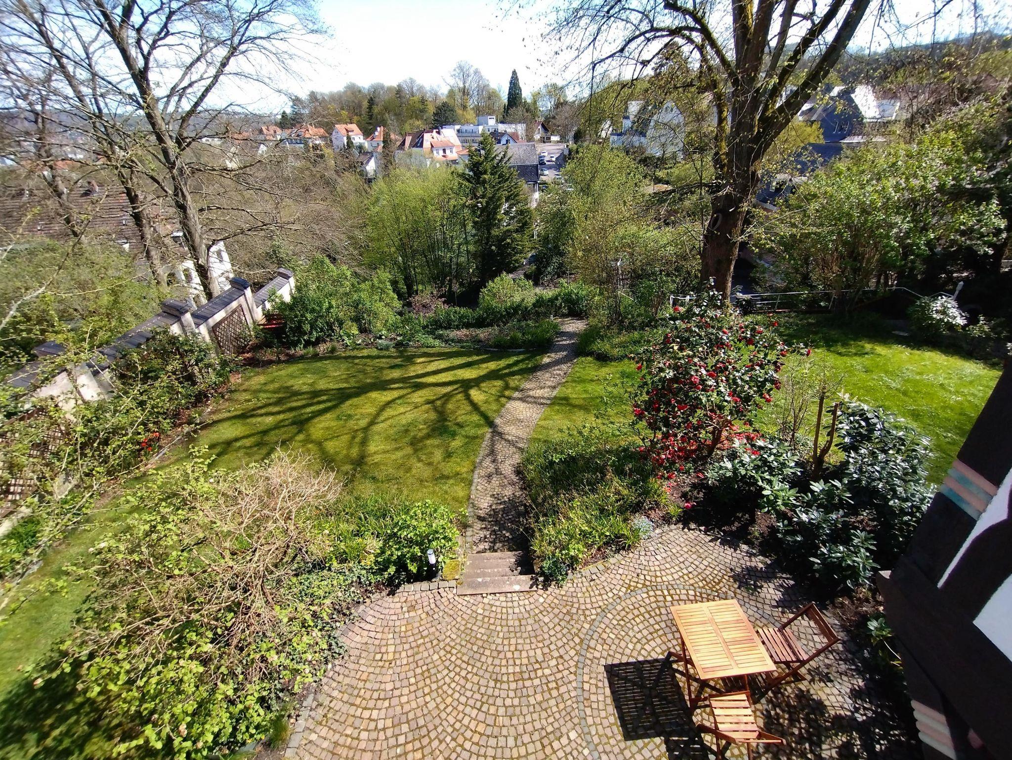 Vor dem Haus sind unentgeltliche Parkplätze vorhanden. Ein schöner Stadtblick sowie ein Garten mit Terrasse entschädigen für ein paar Treppen, die zum Haus genommen werden müssen. Im Gartenhaus stehen Stühle und Tisch für die Terrassennutzung bereit.