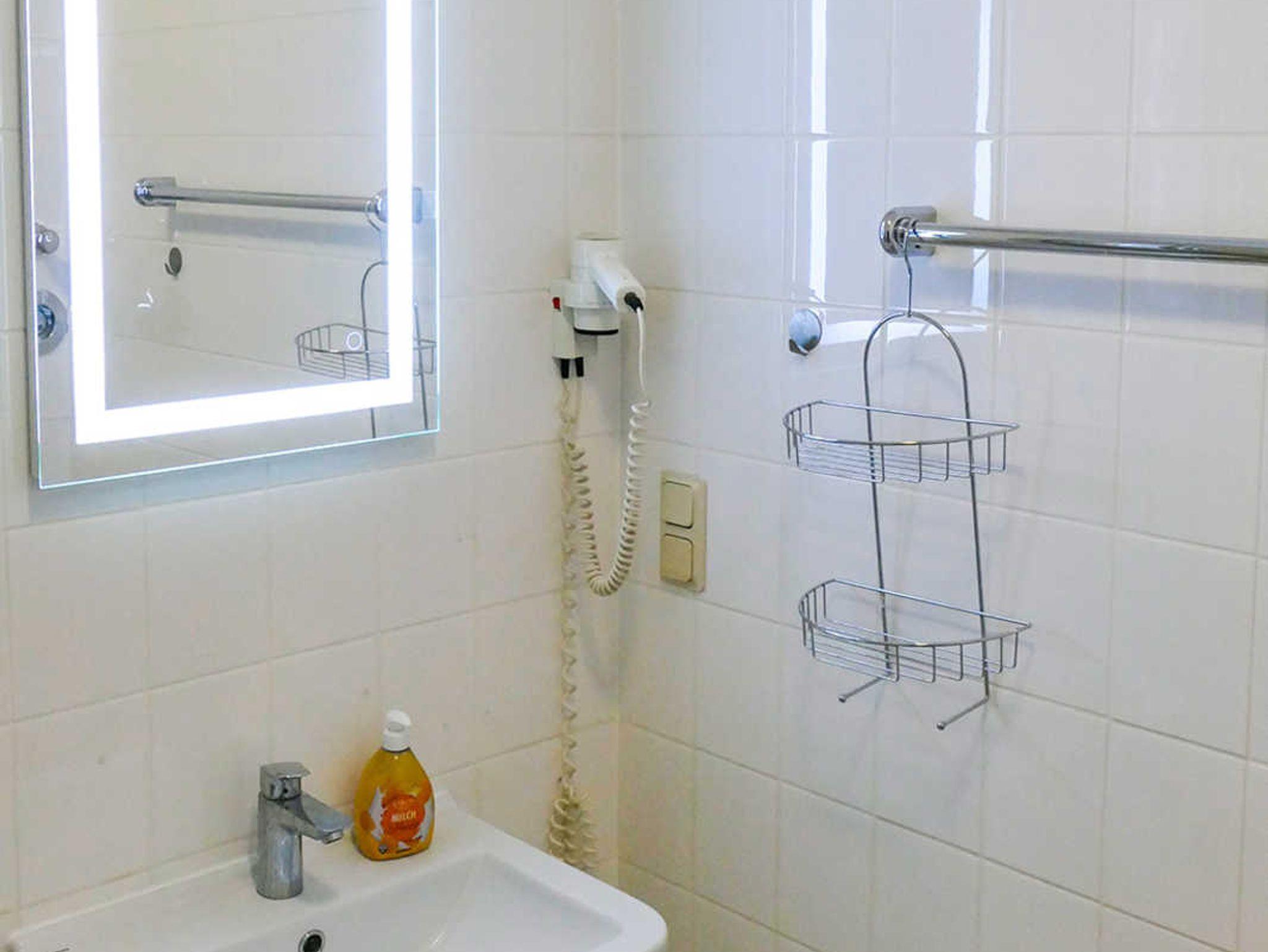 ? Das kleine Bad ist ausgestattet mit Dusche/ WC und Fön .
