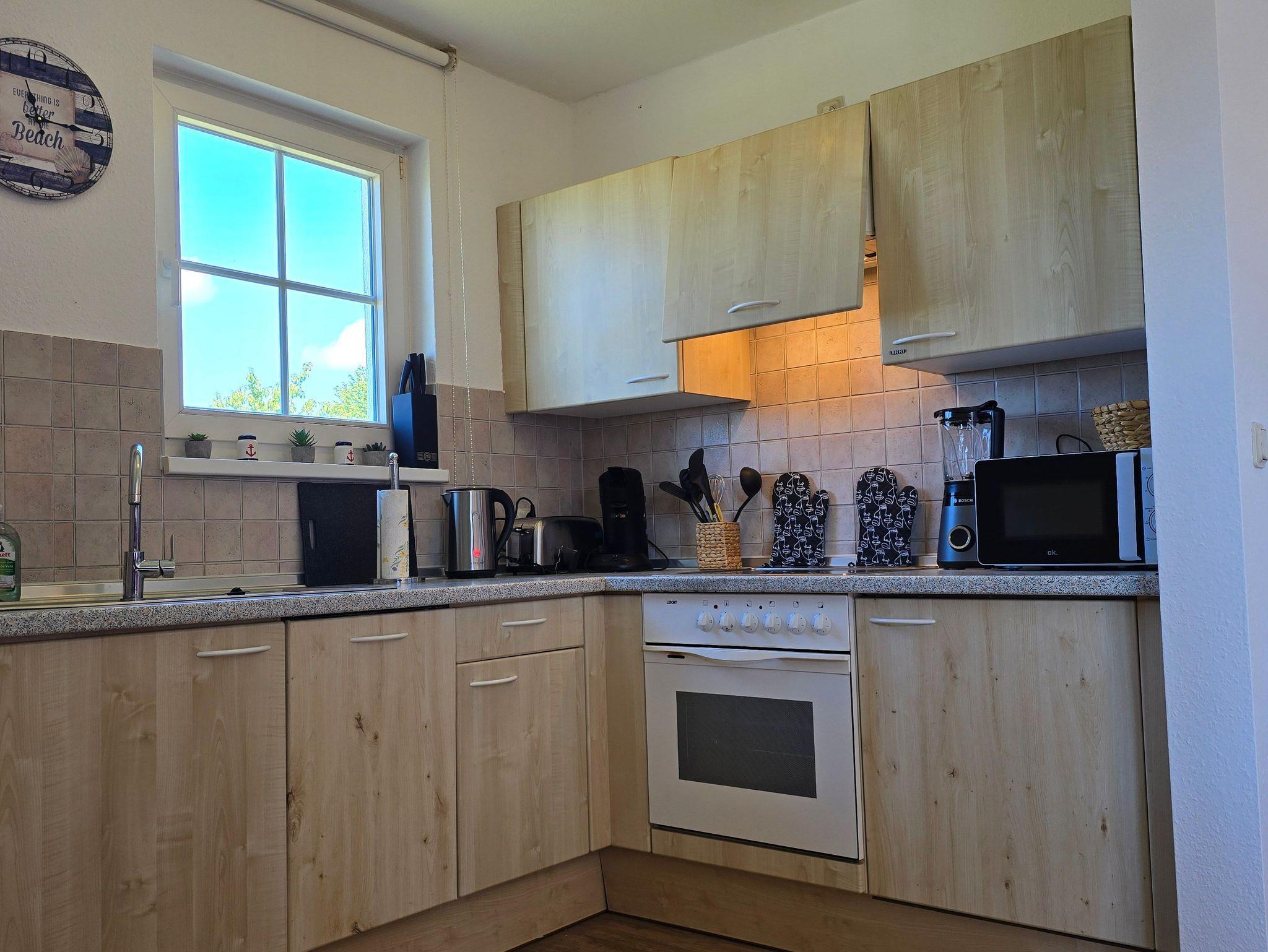 • Die Einbauküche ist offen zum Wohnzimmer und verfügt über einen Kühlschrank mit kleinem TK-Fach, Herd, Backofen, Spülmaschine, Kaffeemaschine, Toaster, Wasserkocher , reichlich Geschirr und anderen Küchenutensilien.
