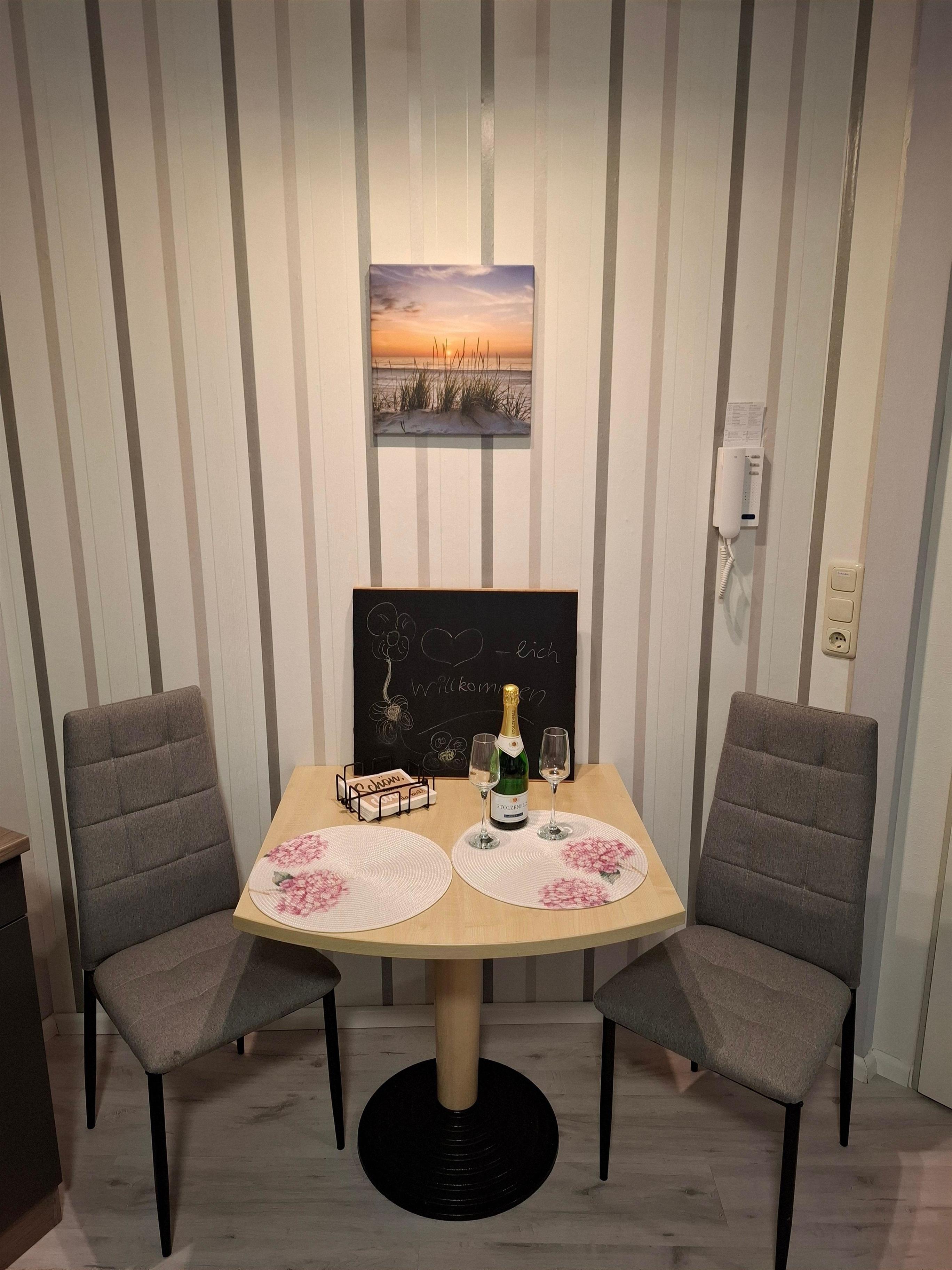 Willkommen in unserer charmanten und gemütlichen Ferienwohnung mit etwa 30 qm Wohnfläche – perfekt für Paare oder Alleinreisende, die einen entspannten Aufenthalt in ruhiger Atmosphäre suchen. Der offen gestaltete Wohn-/Schlafbereich ist liebevoll eingerichtet und verfügt über eine praktische kleine Einbauküche mit allem, was Sie zum Kochen benötigen. Ein gemütlicher Essplatz für zwei Personen lädt zu gemeinsamen Mahlzeiten ein. Nach einem erlebnisreichen Tag können Sie es sich vor dem modernen Flachbildschirm gemütlich machen oder entspannt im kostenfreien WLAN surfen. Für erholsame Nächte sorgt das komfortable Boxspringbett (1,80 m x 2,00 m), das Ihnen erholsamen Schlaf garantiert. Das moderne Badezimmer ist mit einer hochwertigen Dusche ausgestattet und bietet Ihnen eine angenehme Wohlfühlatmosphäre. Unsere Ferienwohnung ist der ideale Rückzugsort, um Ruhe und Komfort zu genießen und gleichzeitig die schöne Umgebung zu erkunden.